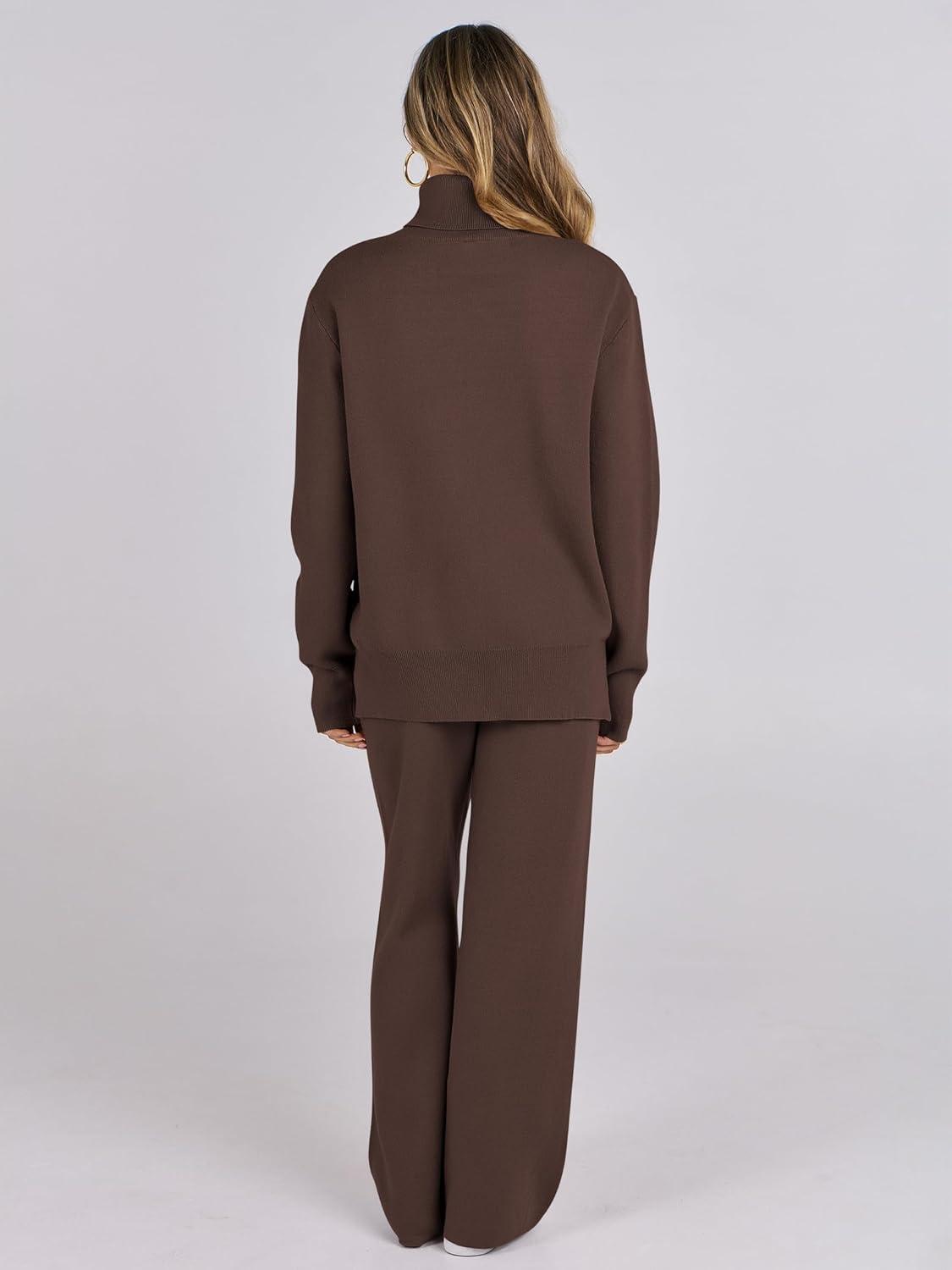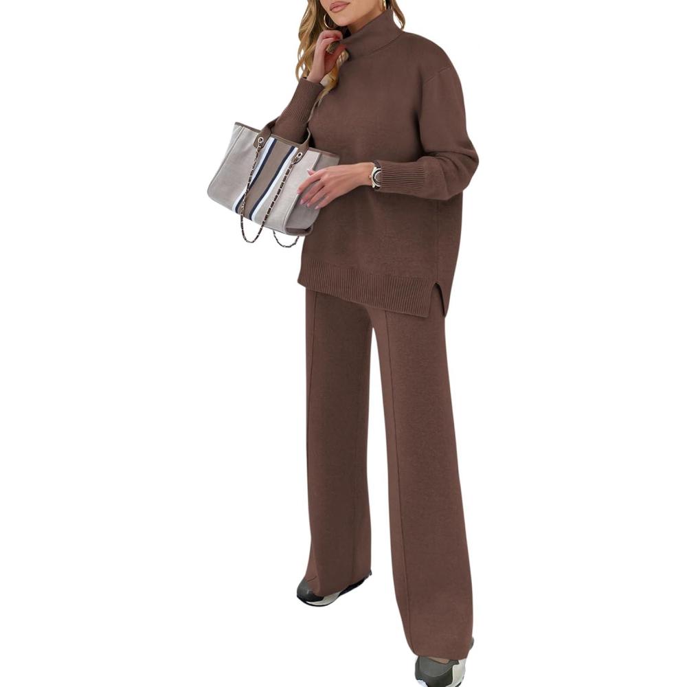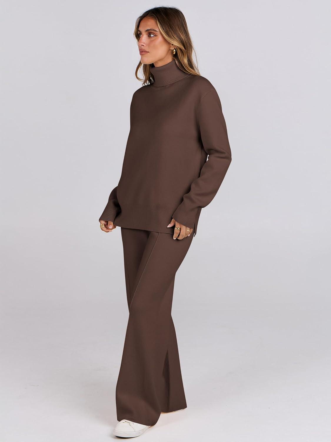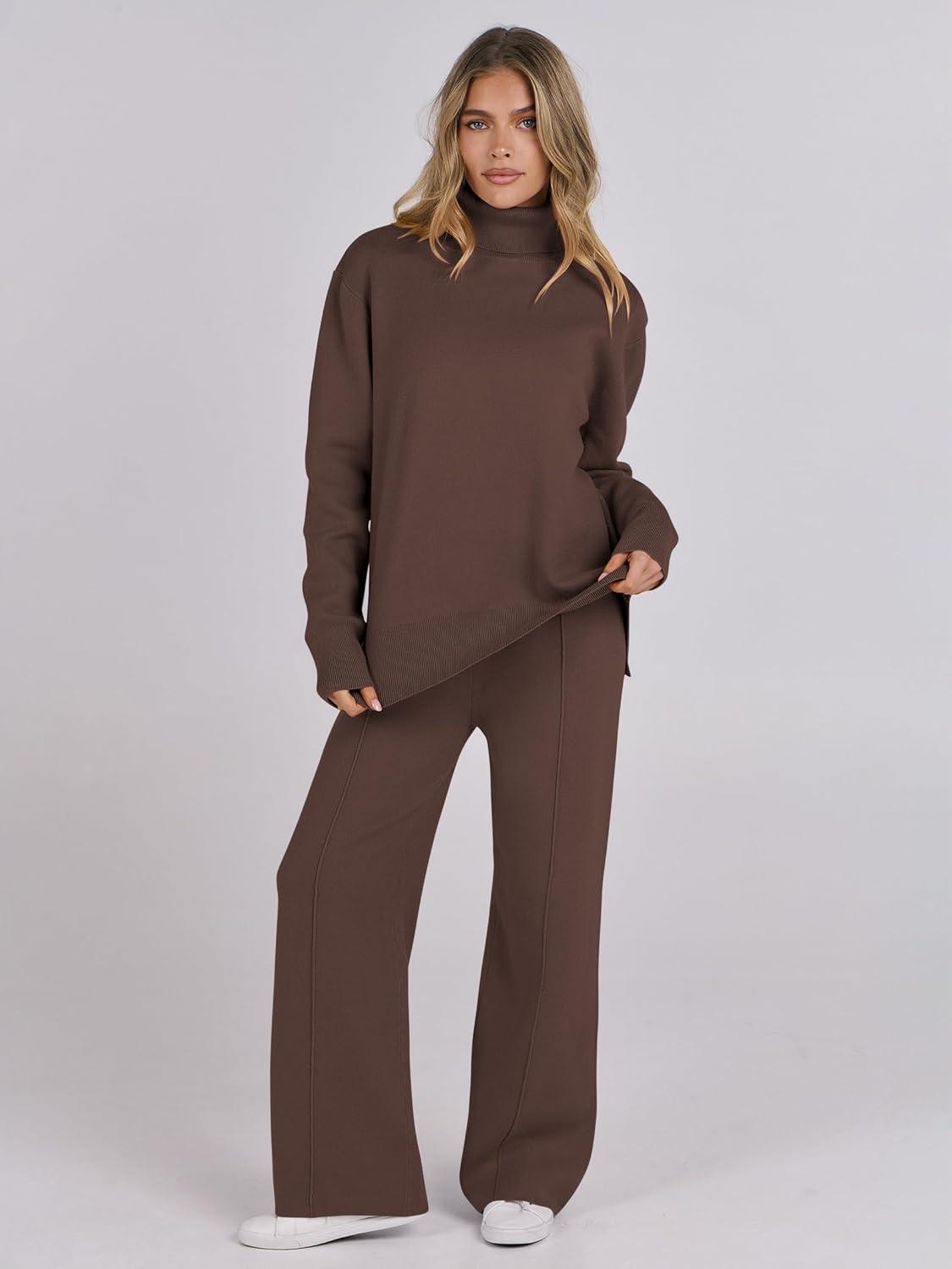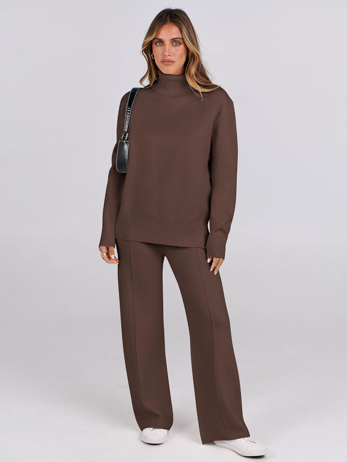 ANRABESS Womens 2 Piece Outfits Turtleneck Matching Lounge Set Sweater Top Wide Leg Pants Fall Cozy Knit Sweatsuit Loungewear(Coffee)