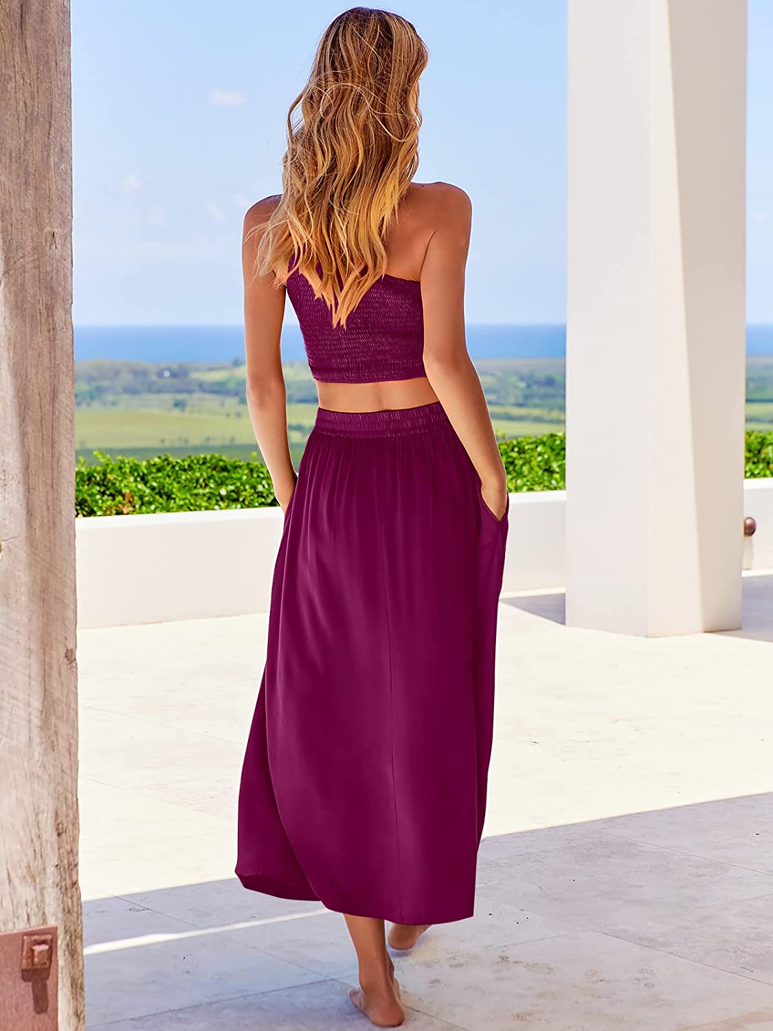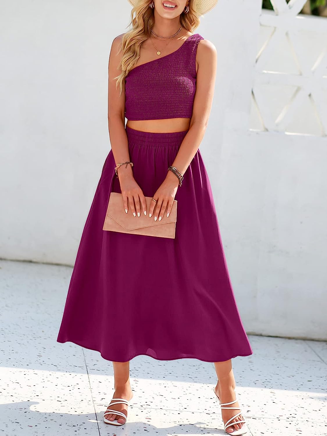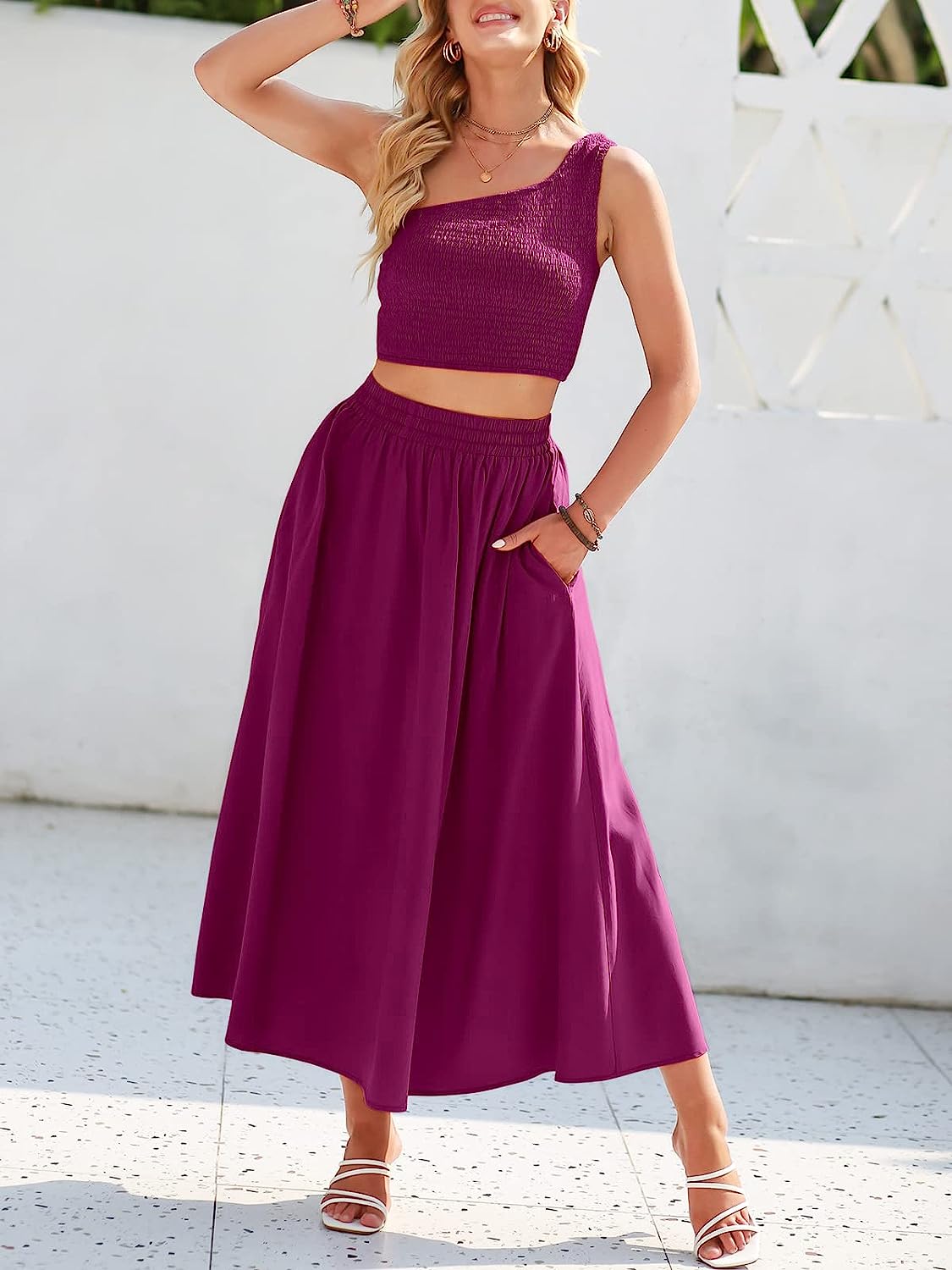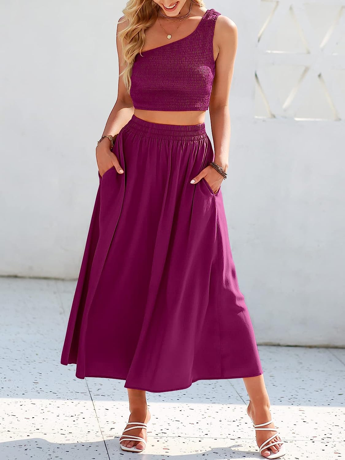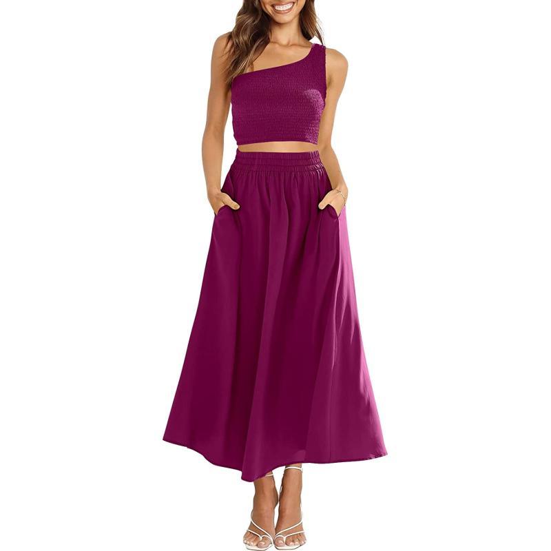 Stylish Design – Flaunt your style in our smocked one-shoulder crop top and high elastic waist long skirt two-piece outfit that comes with pockets and ankle-length skirt.