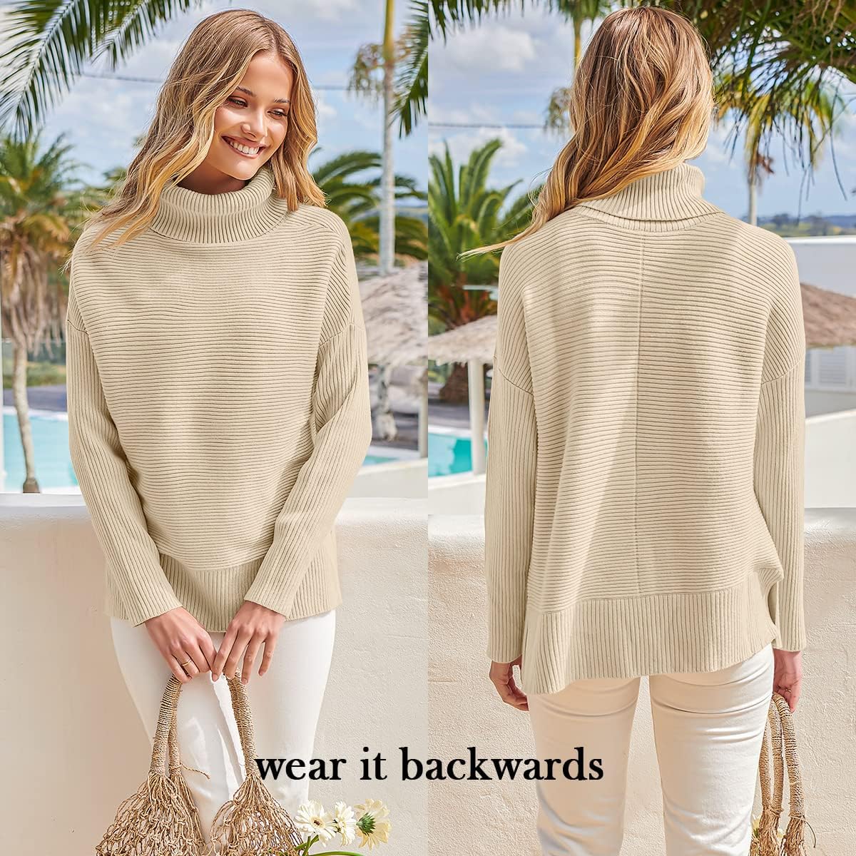 Features – Turtleneck,ribbed knit,seam front,long batwing sleeve,high low hem,solid color,top sweater,knitwear casual style