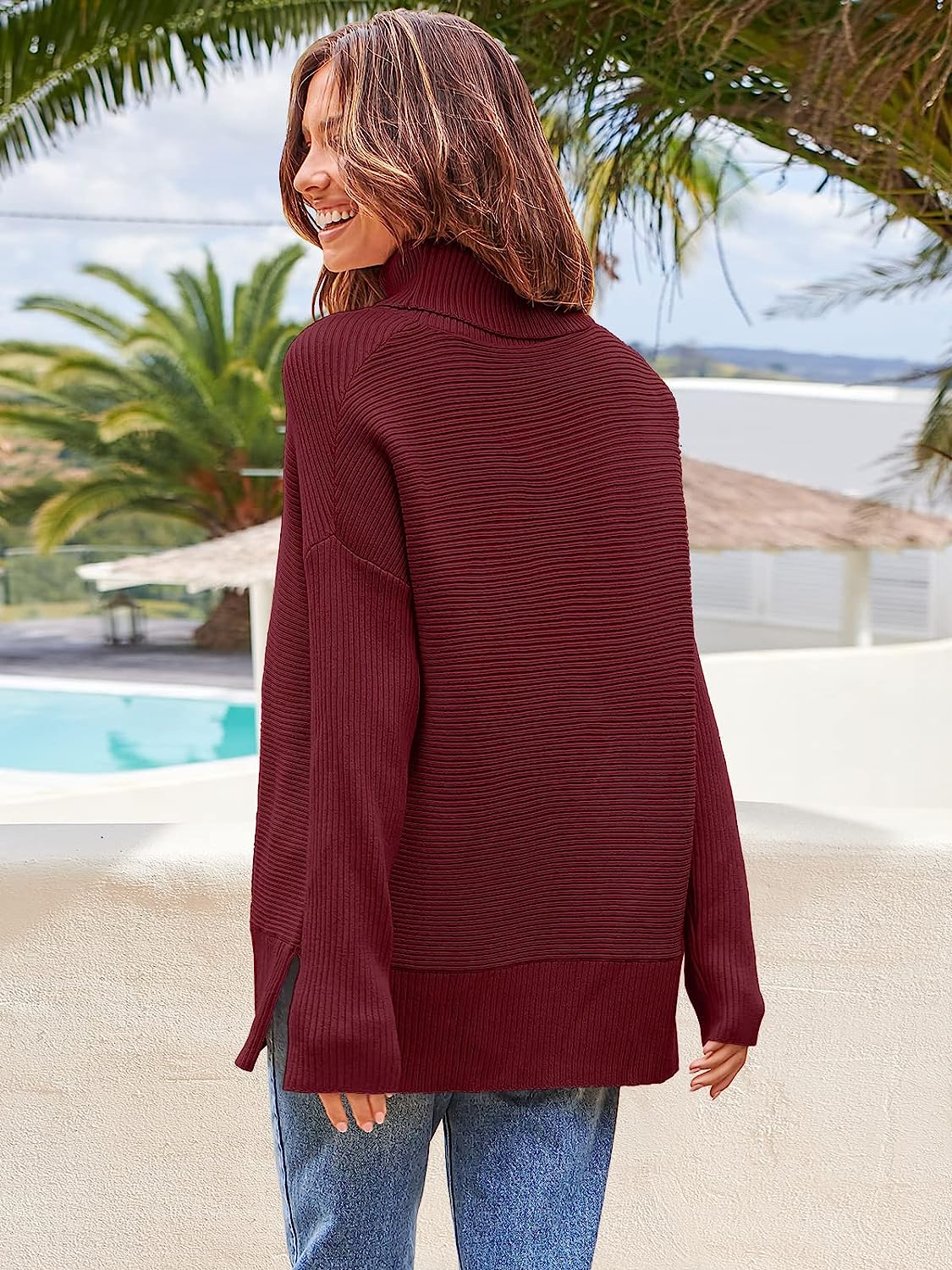 ANRABESS Womens 2022 Fall Sweaters Turtleneck Long Batwing Sleeve Spilt Hem Pullover Knit Sweater Tops(Wine Red)