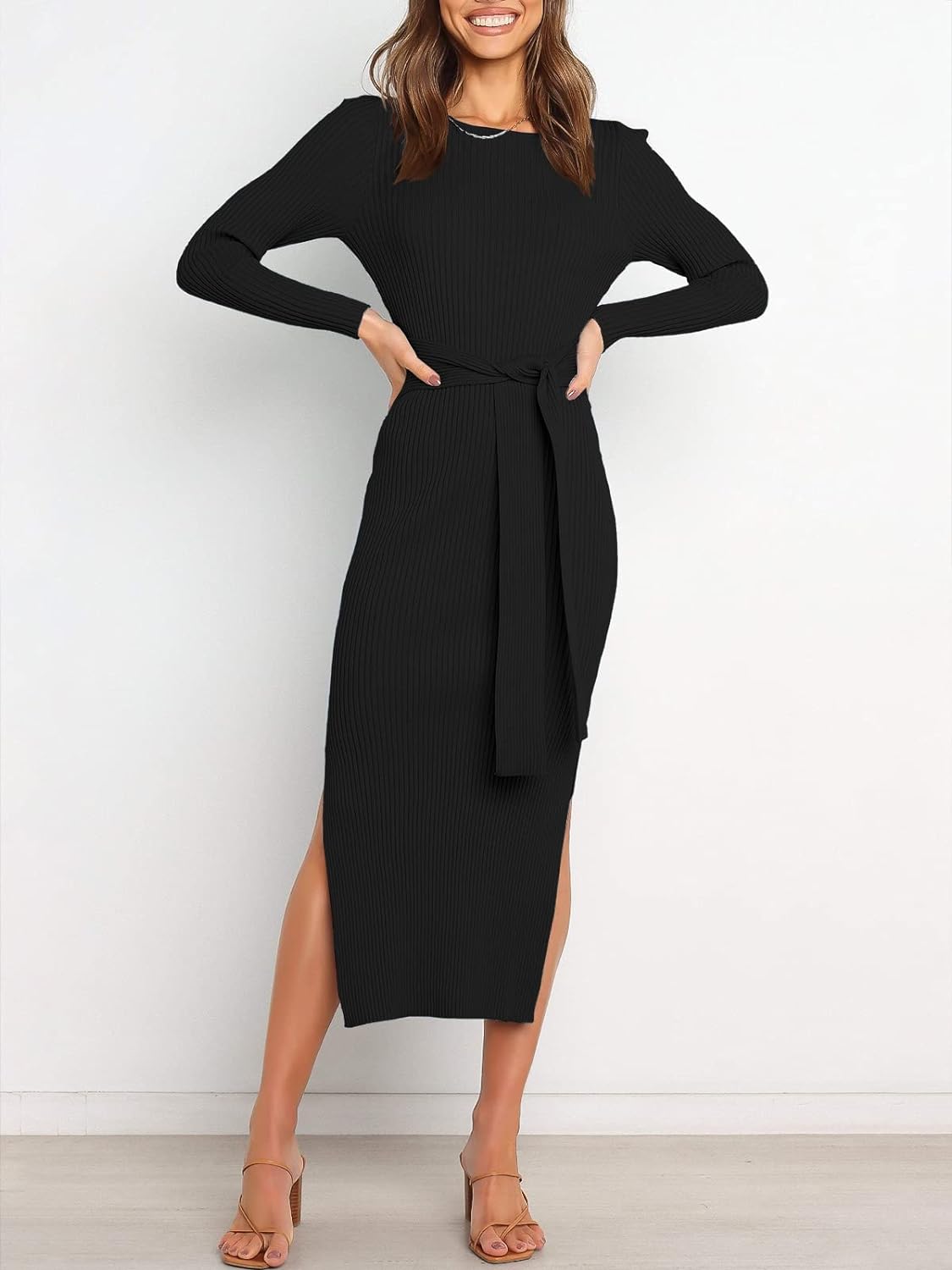 Be the first to review “ANRABESS Women’s 2023 Fall Elegant Sweater Dress Long Sleeve Crewneck Tie Waist Slim Rib Knit Slit Bodycon Midi Dress(Black)” Cancel reply