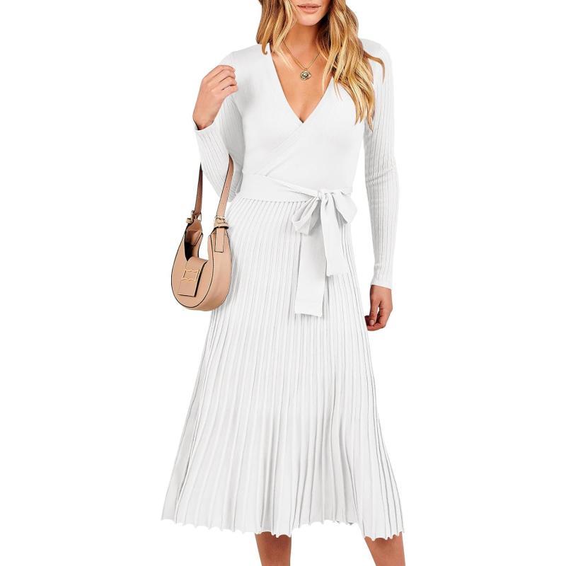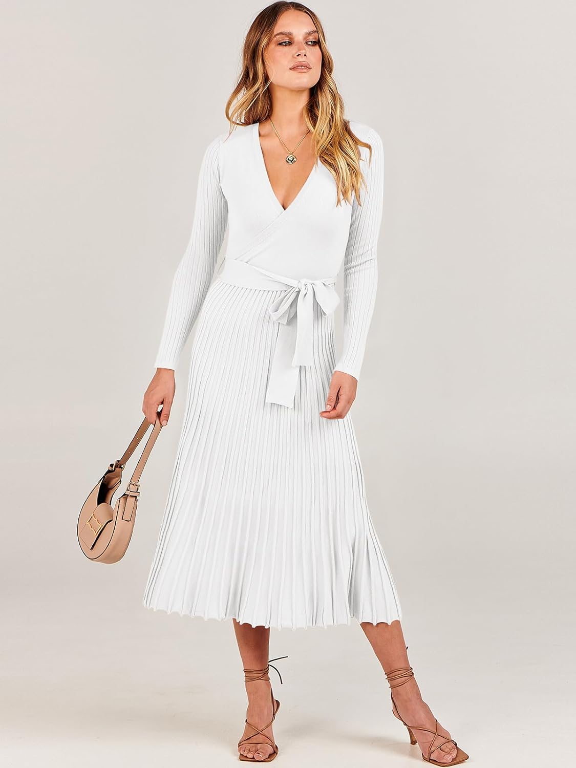 ANRABESS Women’s 2023 Fall Long Sleeve Sweater Dress Wrap V Neck Pleated Ribbed Knit A Line Belted Tie Waist Midi Dress(White)