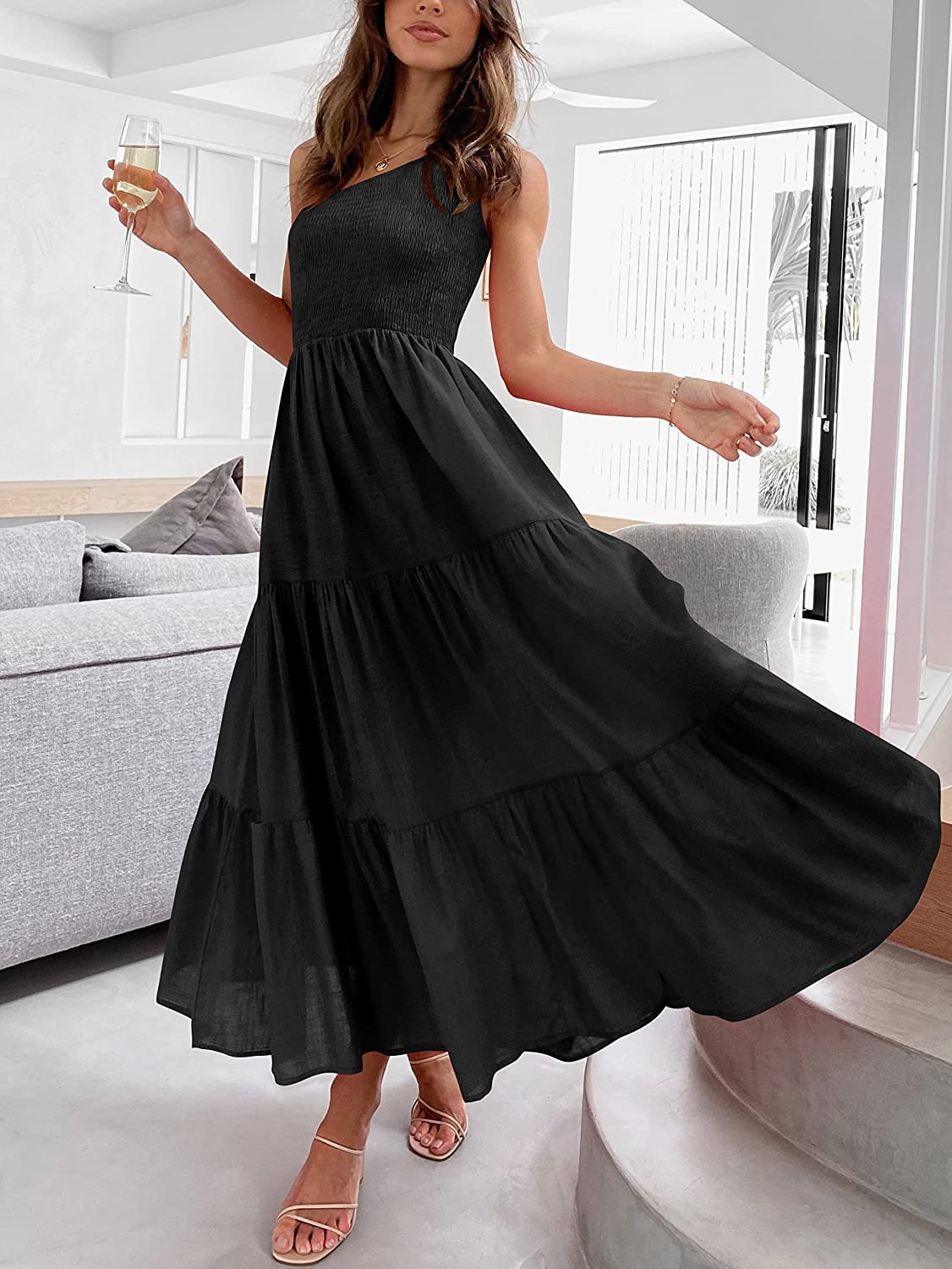 ANRABESS Women’s 2023 Summer Bohemian One Shoulder Sleeveless Smocked Ruffle Tiered Beach Maxi Sun Dress(Black)