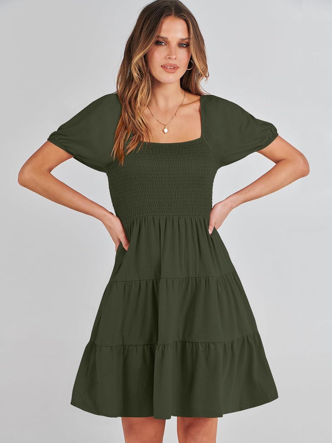 ANRABESS Womens 2025 Summer Casual Dress Square Neck Puff Sleeve Boho Beach Vacation Short Dress(Army Green)