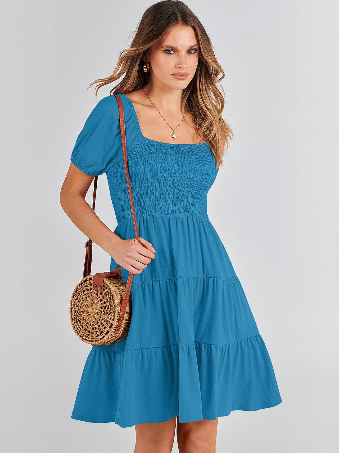 ANRABESS Womens 2025 Summer Casual Dress Square Neck Puff Sleeve Boho Beach Vacation Short Dress(Deep Sky Blue)