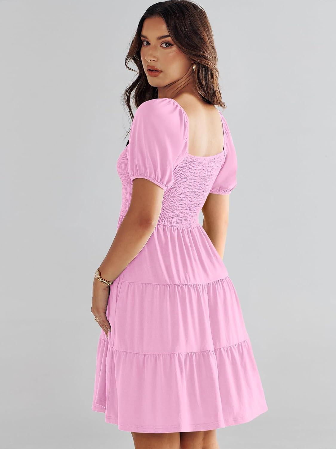ANRABESS Womens 2025 Summer Casual Dress Square Neck Puff Sleeve Boho Beach Vacation Short Dress(Pink)