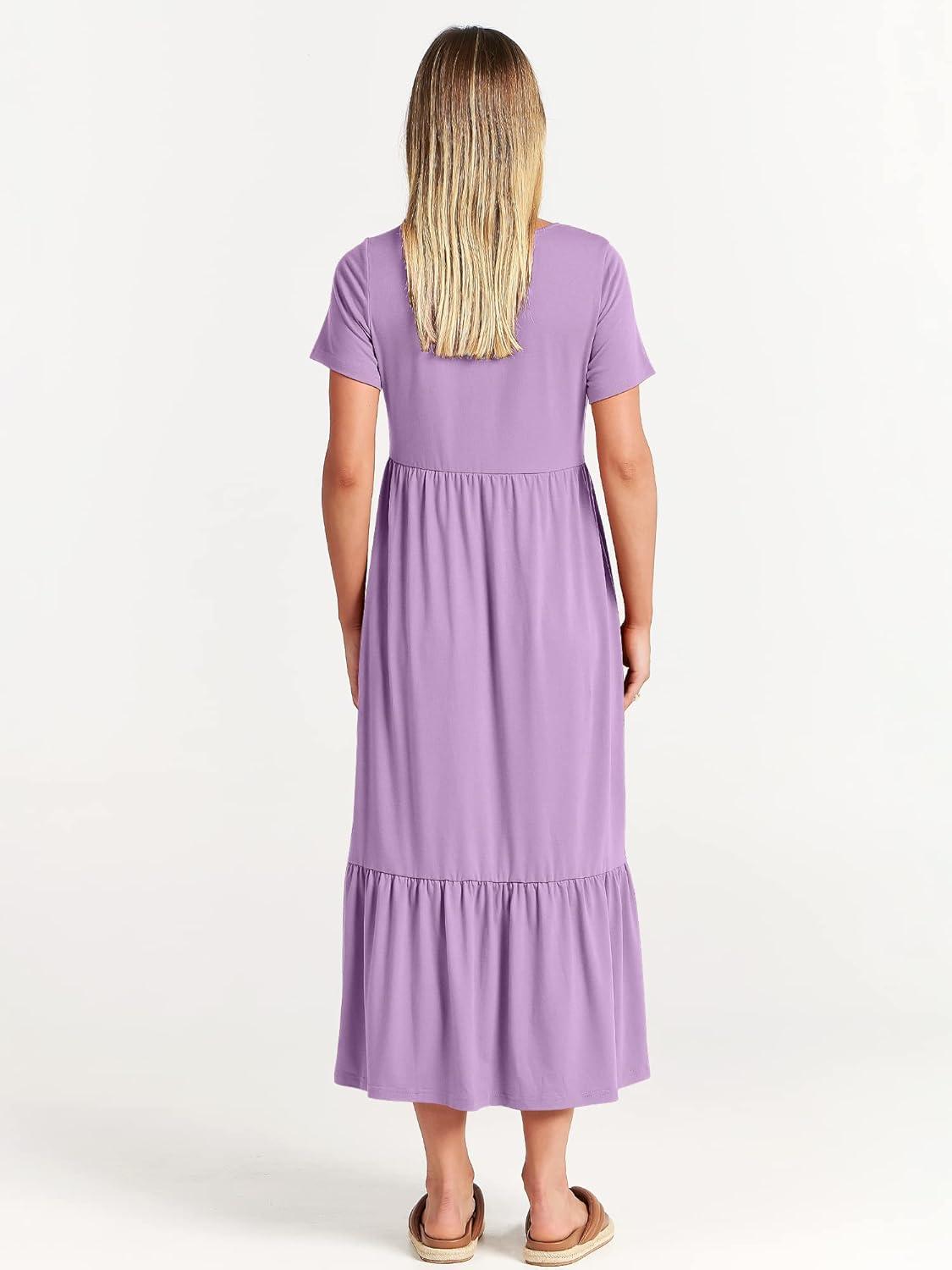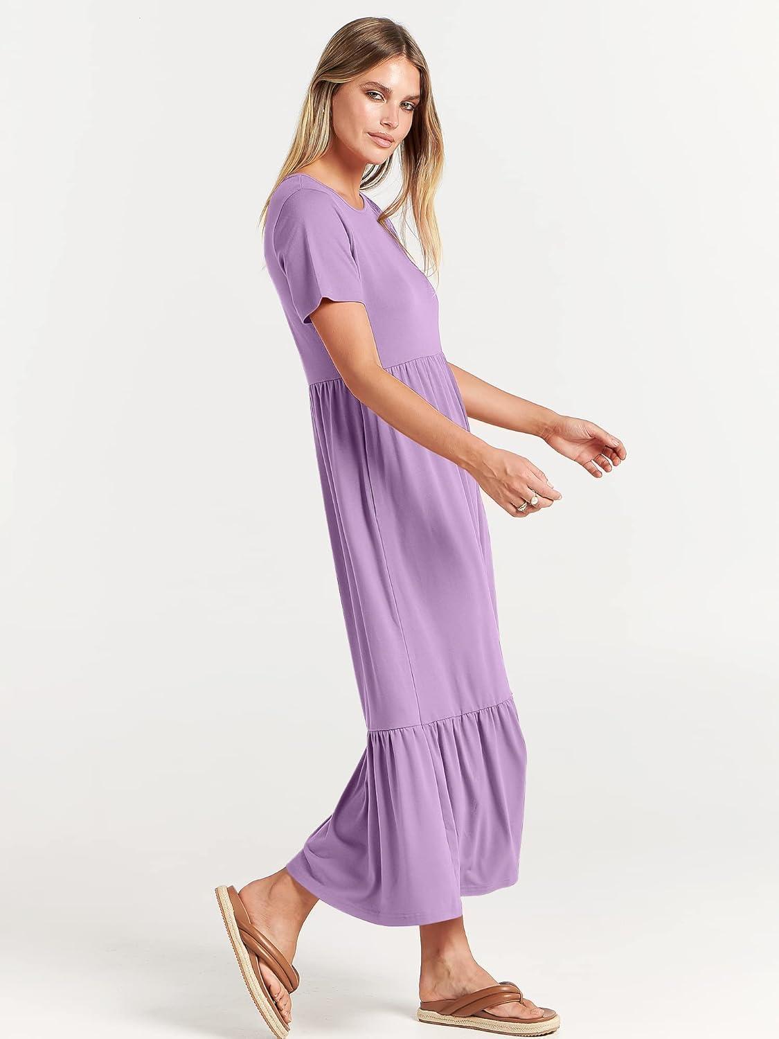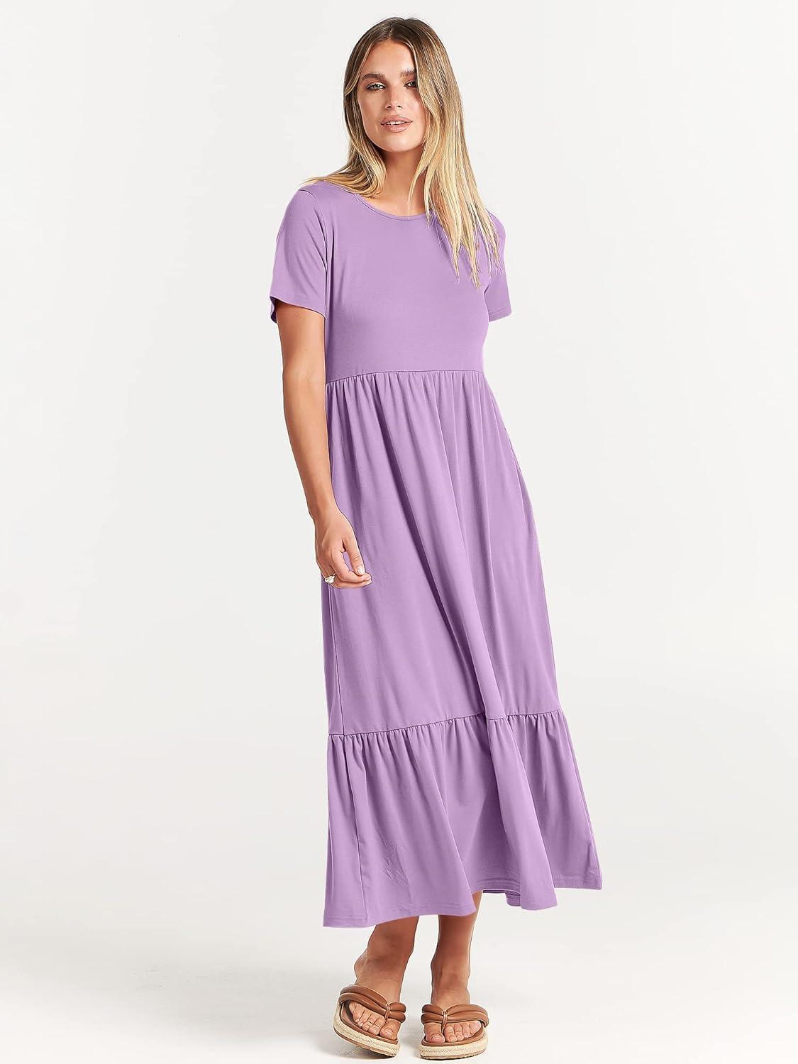 ANRABESS Womens 2025 Summer Casual Maxi Dress A line Tiered Flowy Short Sleeve Crewneck T Shirt Beach Travel Long Dresses(Lilac)
