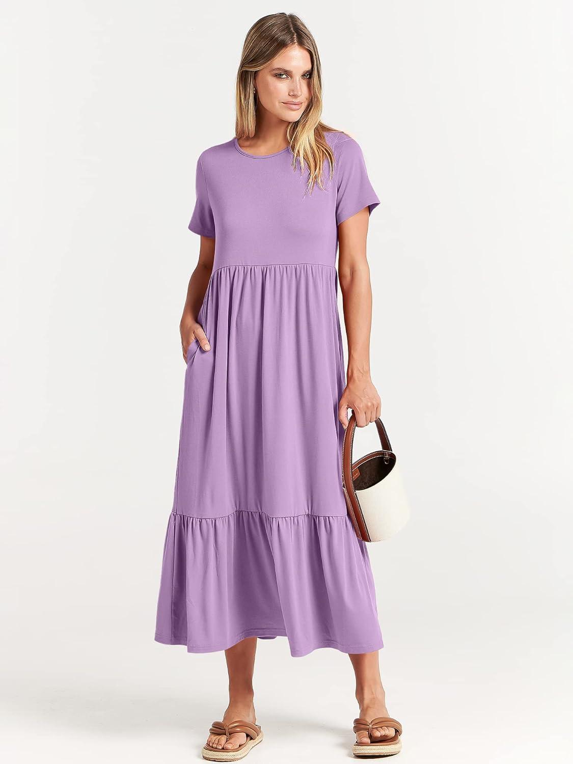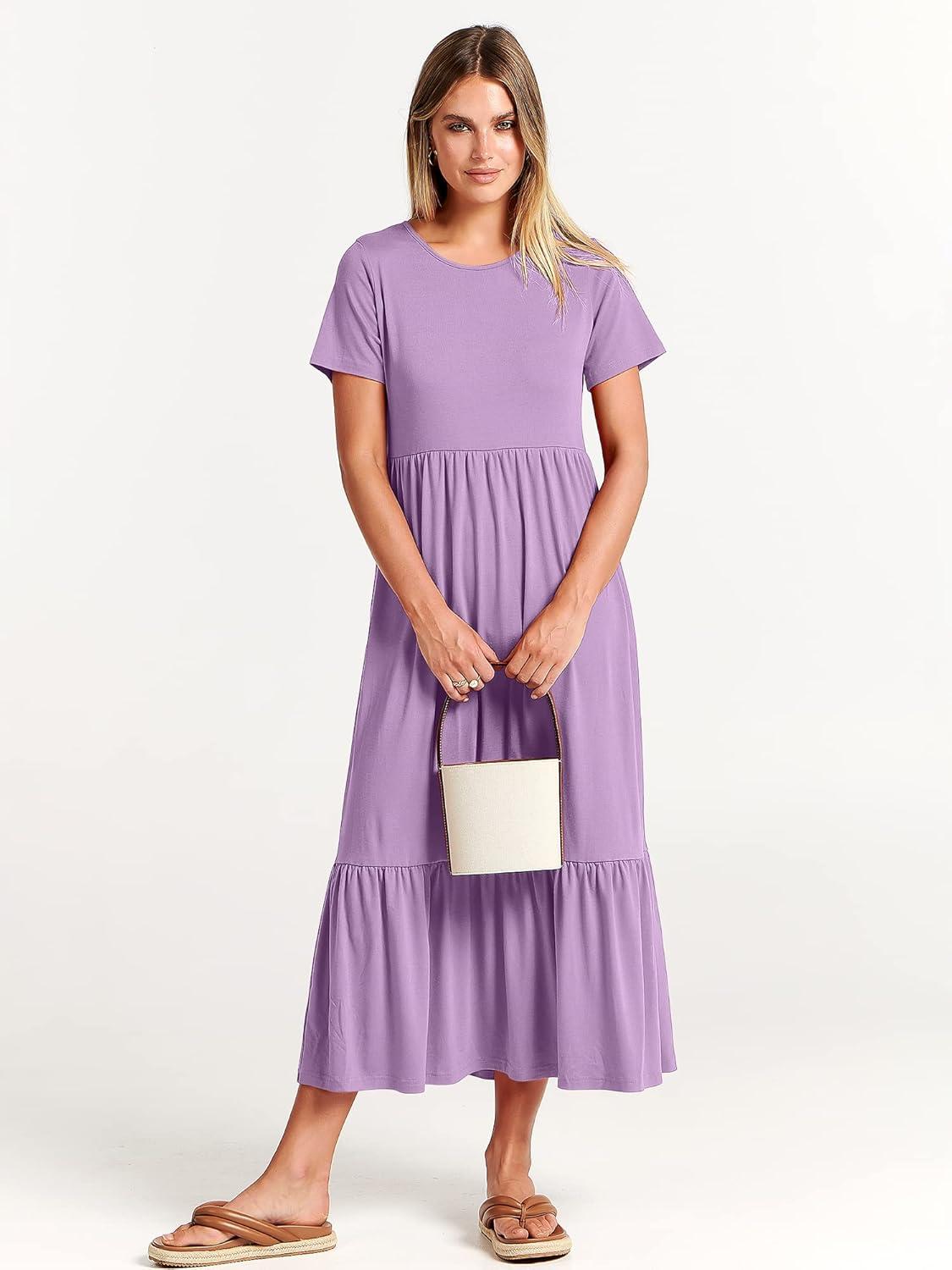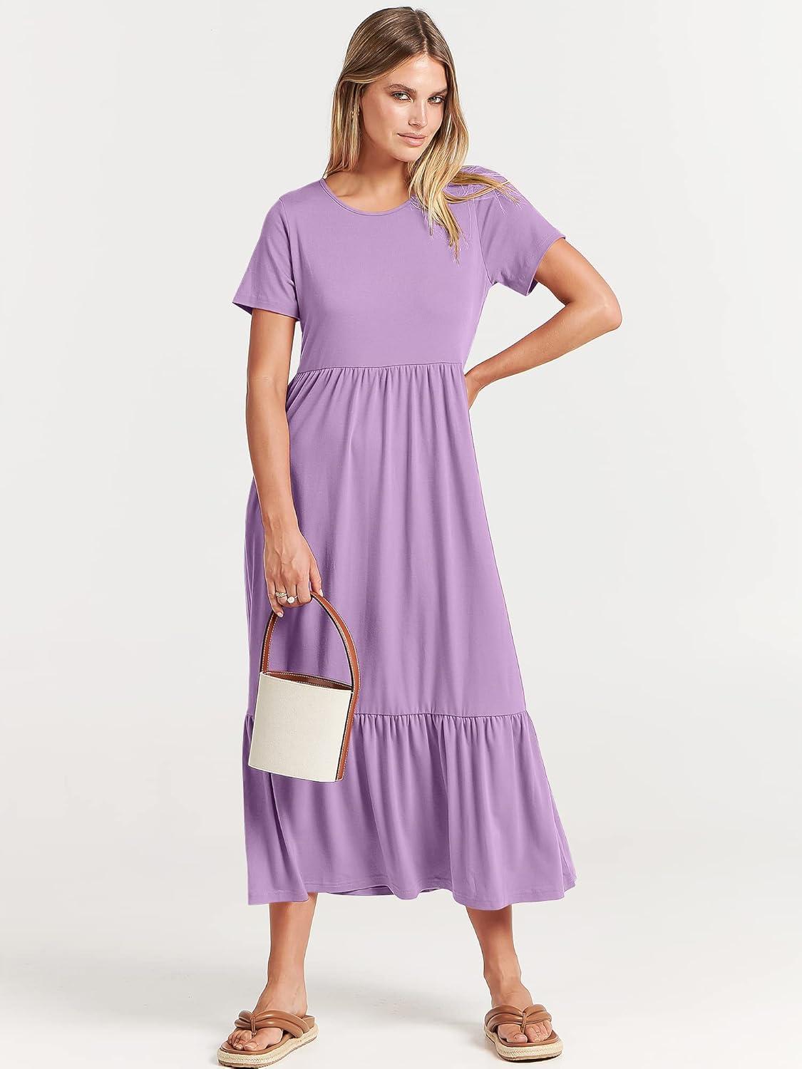 ANRABESS Womens 2025 Summer Casual Maxi Dress A line Tiered Flowy Short Sleeve Crewneck T Shirt Beach Travel Long Dresses(Lilac)