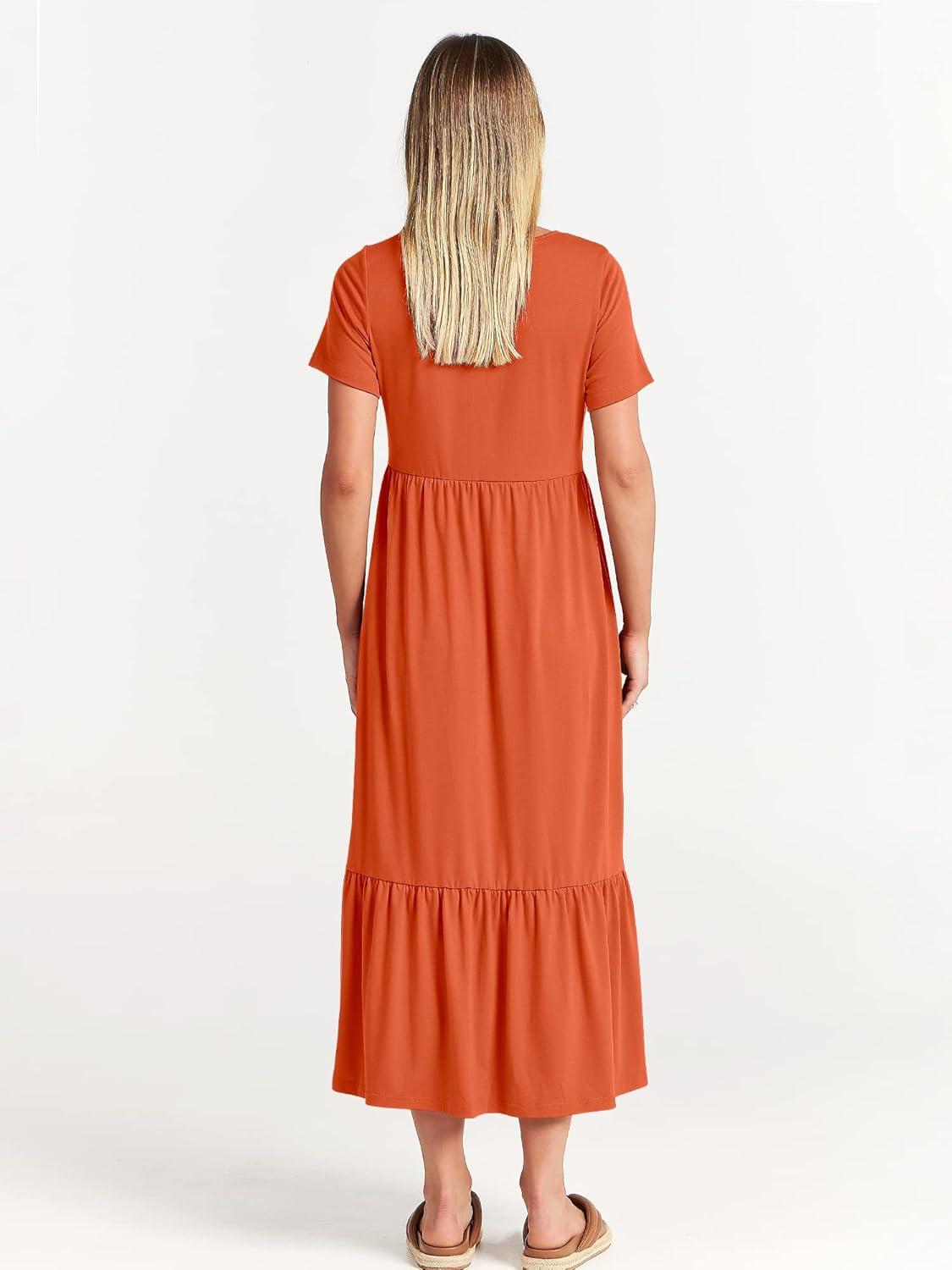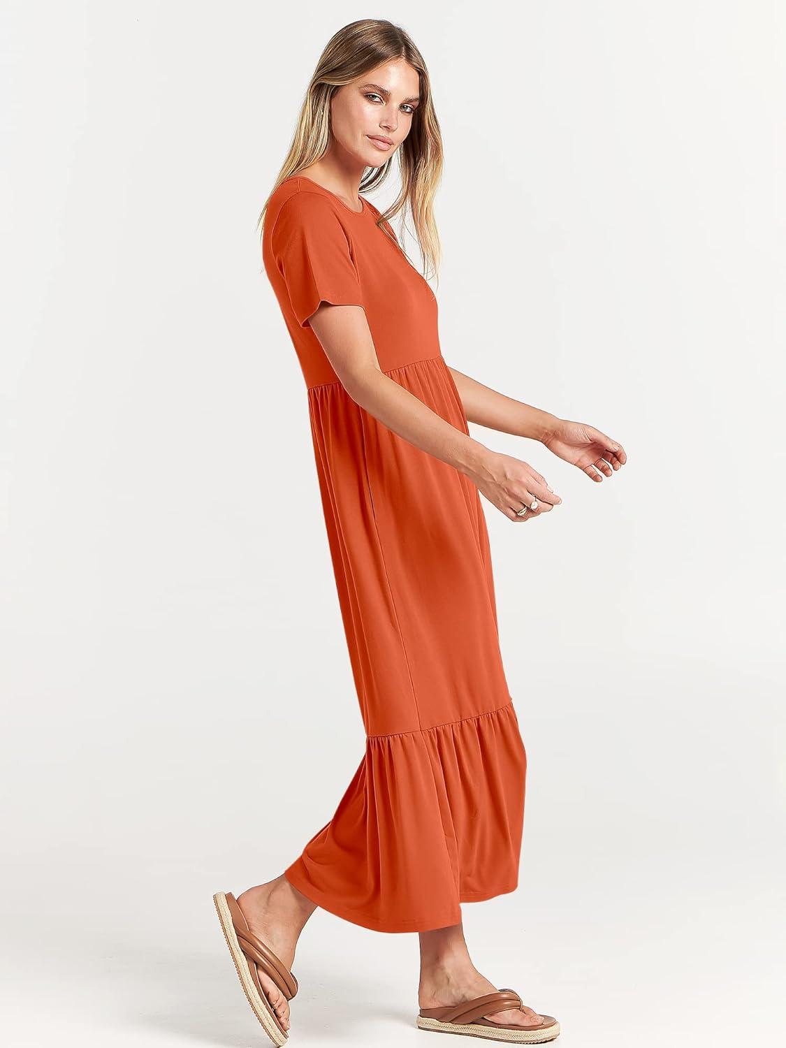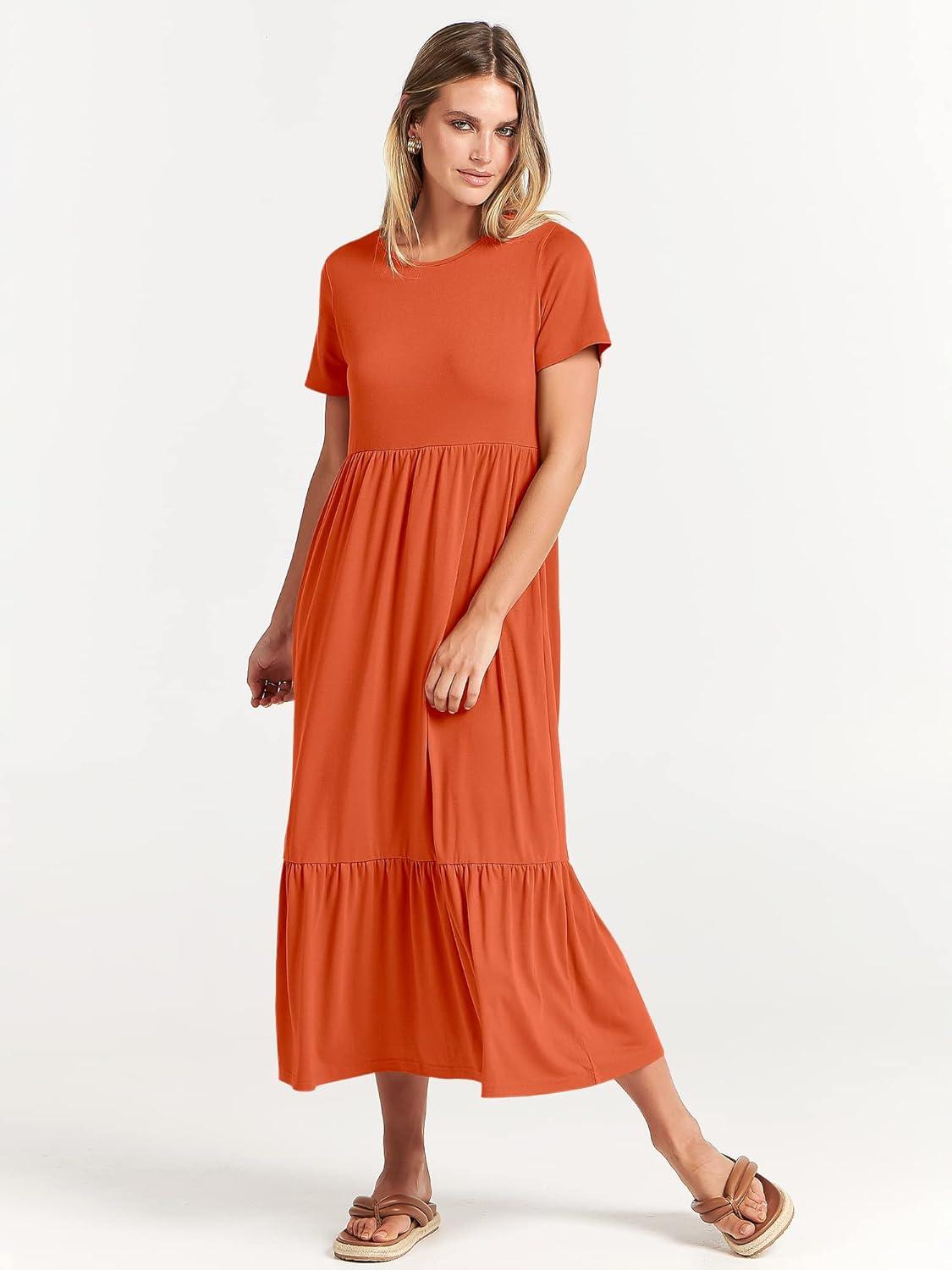 ANRABESS Womens 2025 Summer Casual Maxi Dress A line Tiered Flowy Short Sleeve Crewneck T Shirt Beach Travel Long Dresses(Orange)