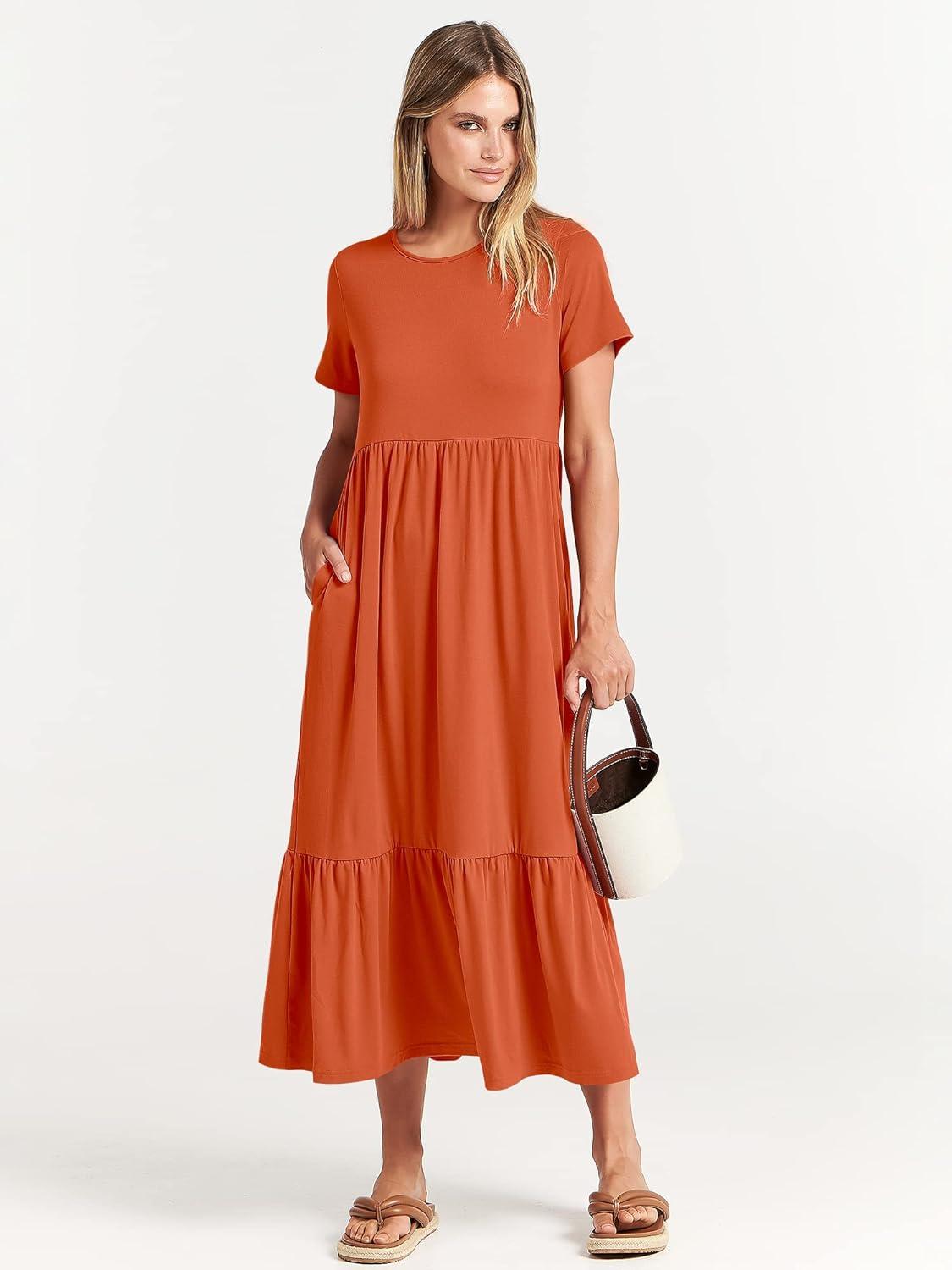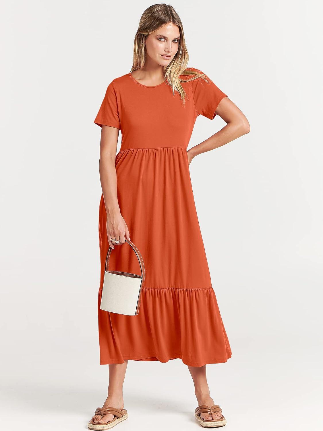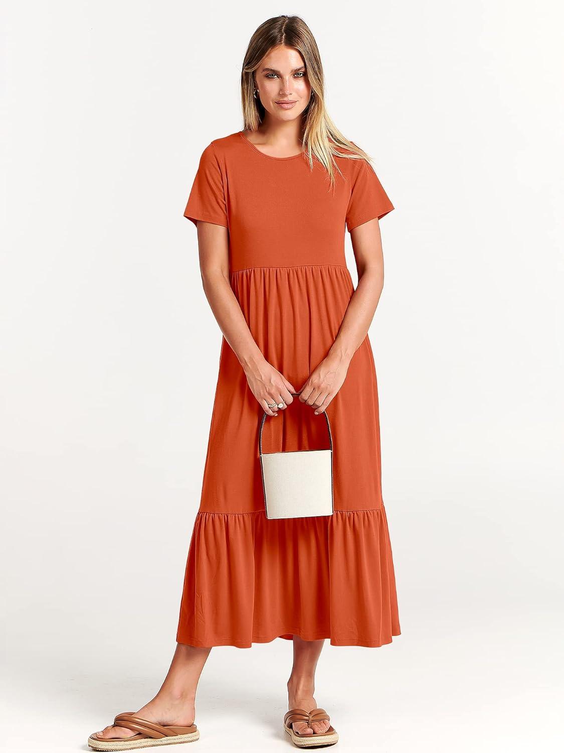 ANRABESS Womens 2025 Summer Casual Maxi Dress A line Tiered Flowy Short Sleeve Crewneck T Shirt Beach Travel Long Dresses(Orange)