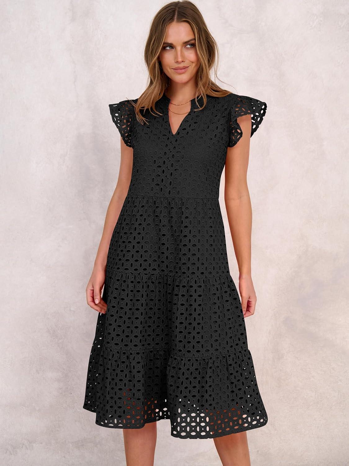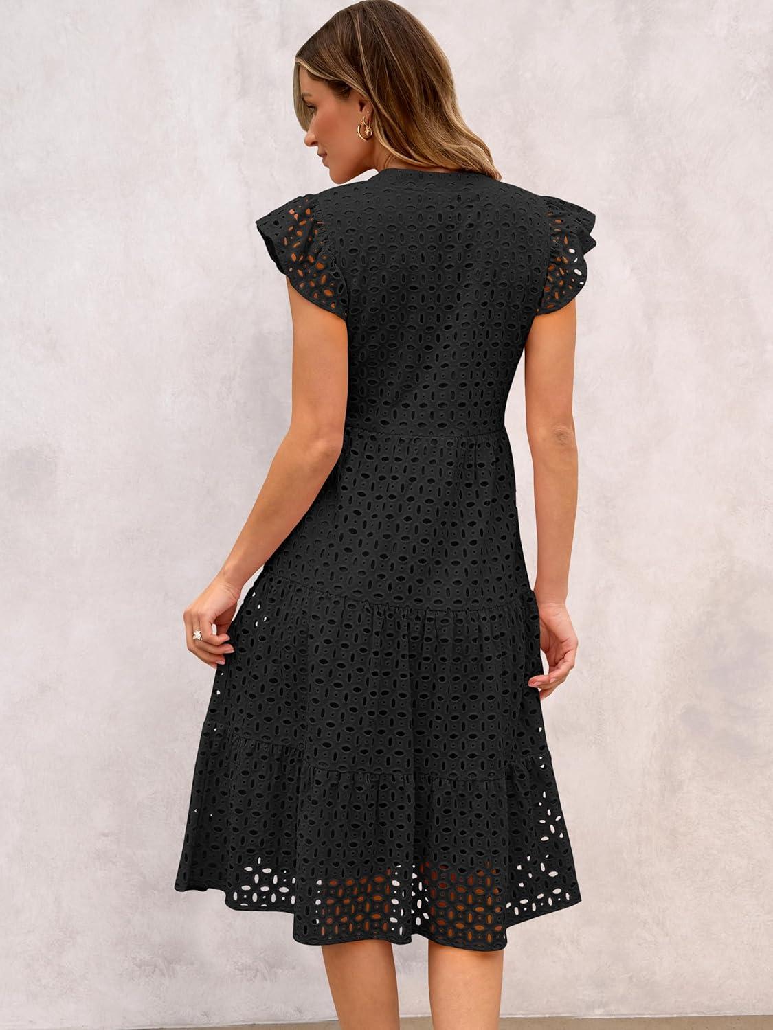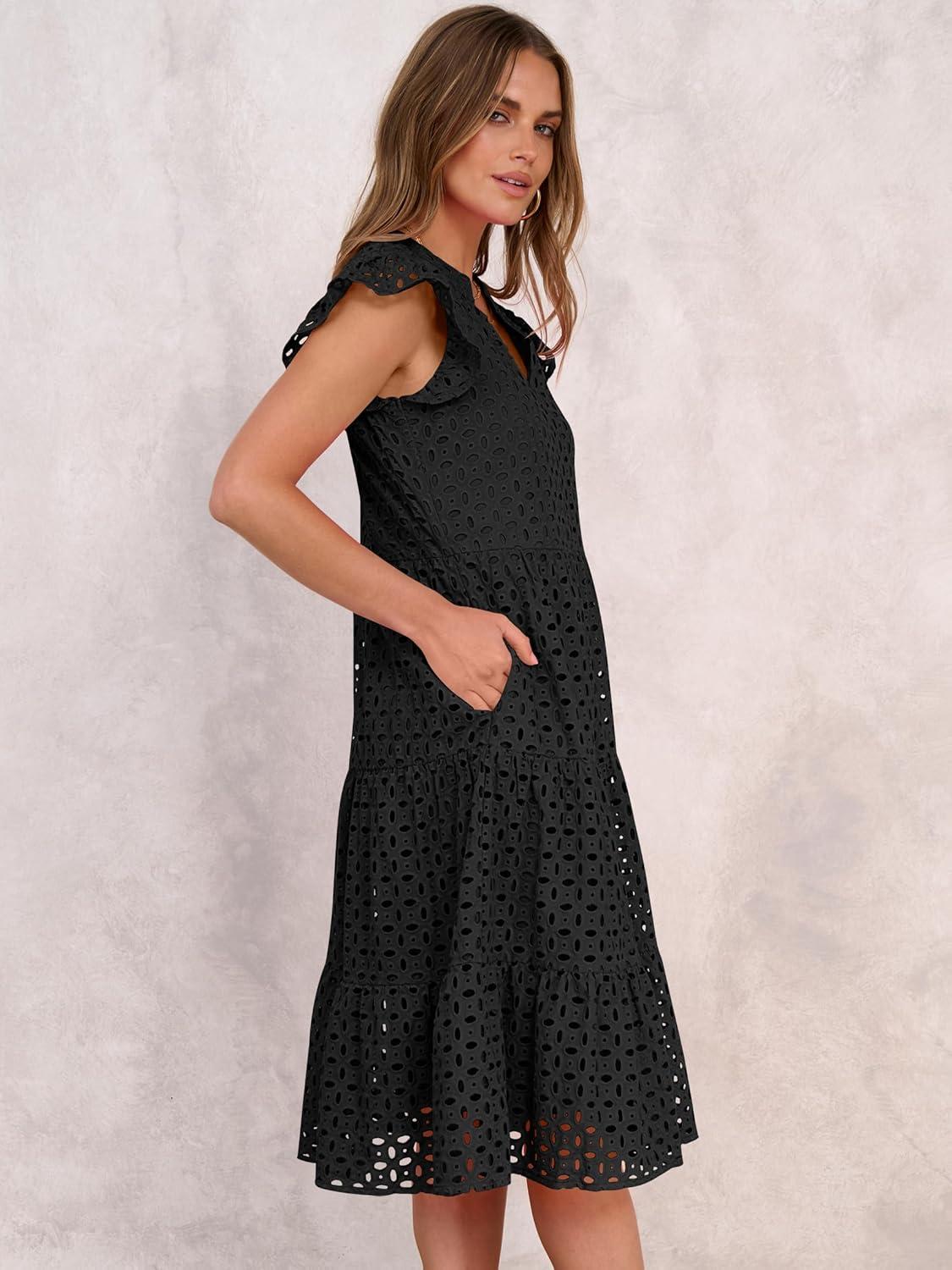 ANRABESS Womens 2025 Summer Midi Dress Hollow Out Eyelet Ruffle Sleeve V Neck Casual Flowy Tiered Beach Vacation Sundress(Black)