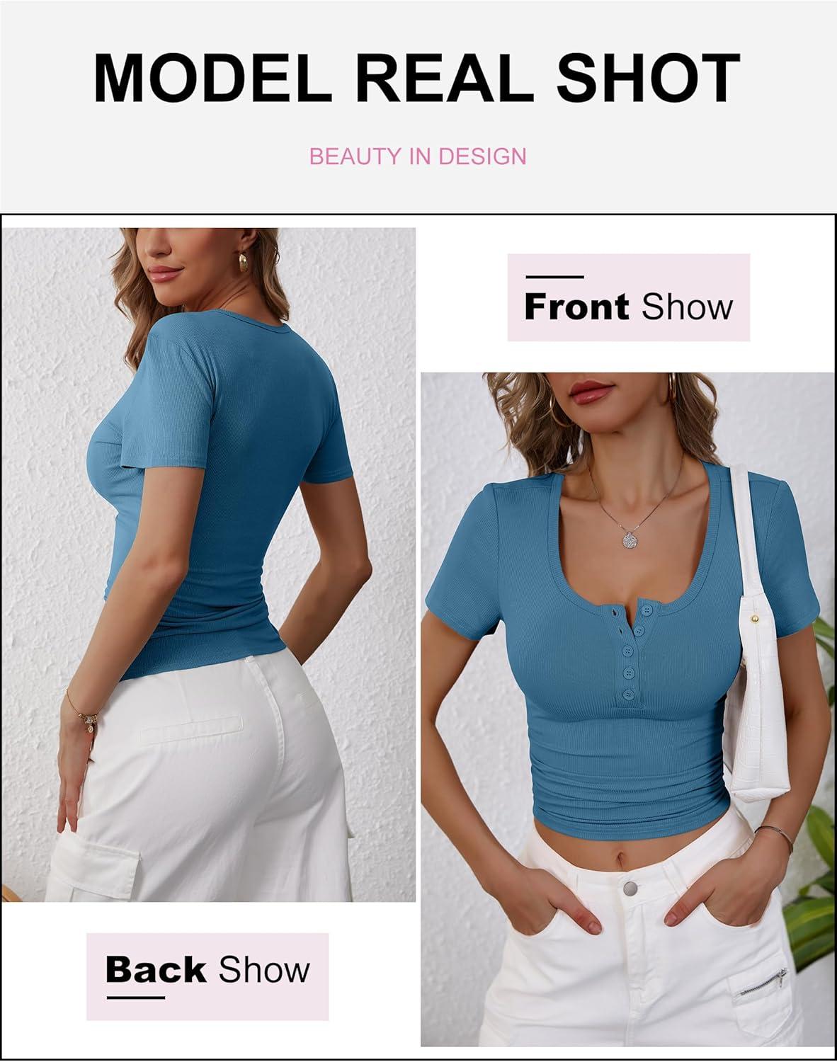 ANRABESS Womens 2025 Summer Short Sleeve Tops Ribbed Knit Henley Button Up Slim Fit Basic Casual T Shirts Blouse Fall Outfits(Indigo)