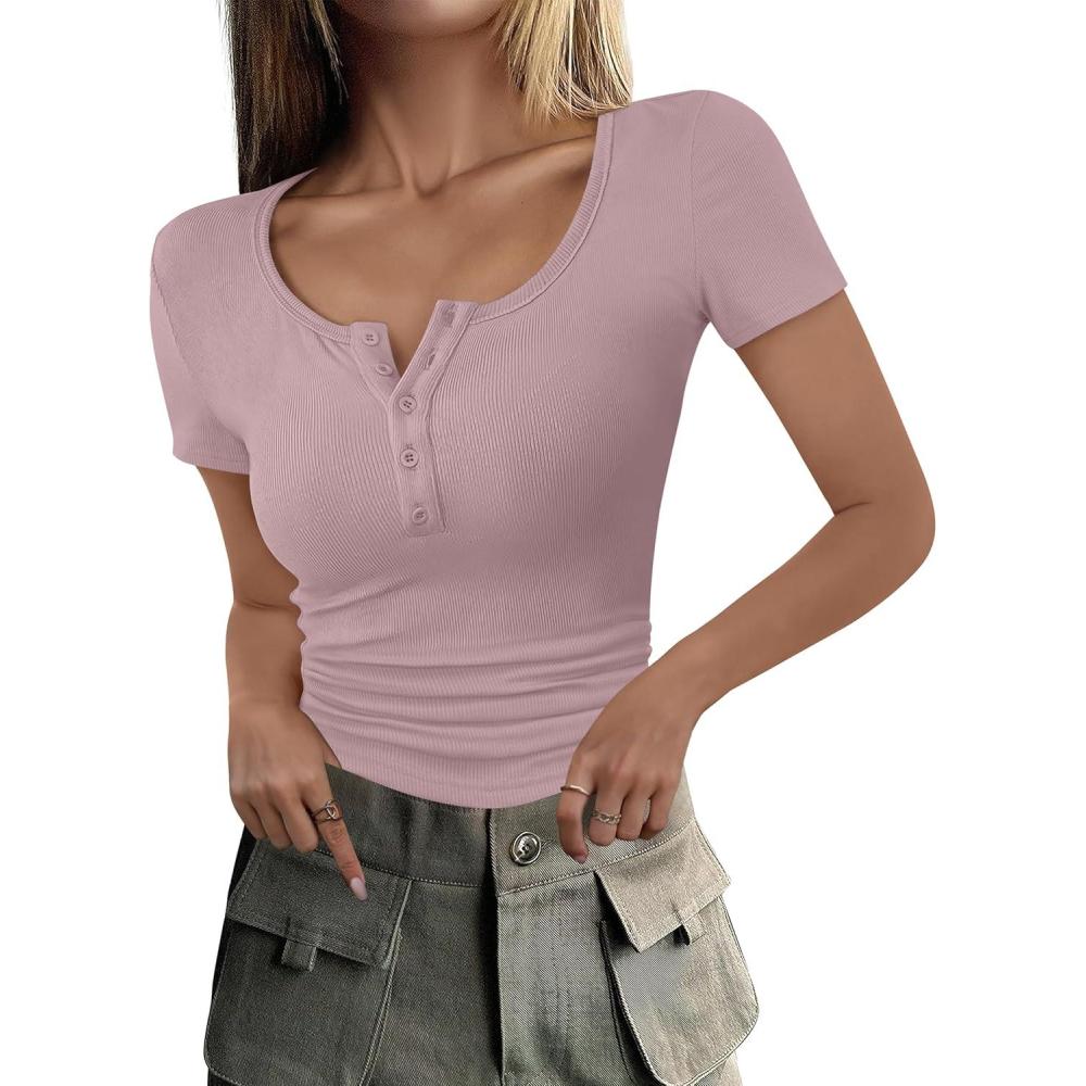 imageANRABESS Womens 2025 Summer Short Sleeve Tops Ribbed Knit Henley Button Up Slim Fit Basic Casual T Shirts Blouse Fall OutfitsPink