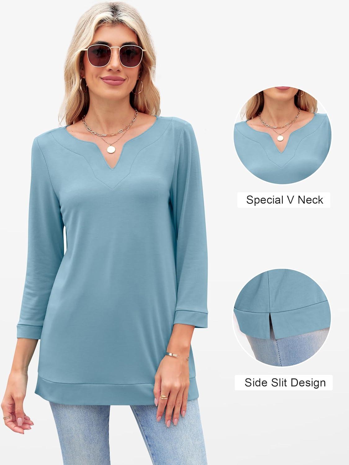 ANRABESS Womens 3/4 Length Sleeve Tops V Neck Basic Tee Shirts 2025 Spring Summer Dressy Casual Tunic Blouses Outfits(Lake Blue)