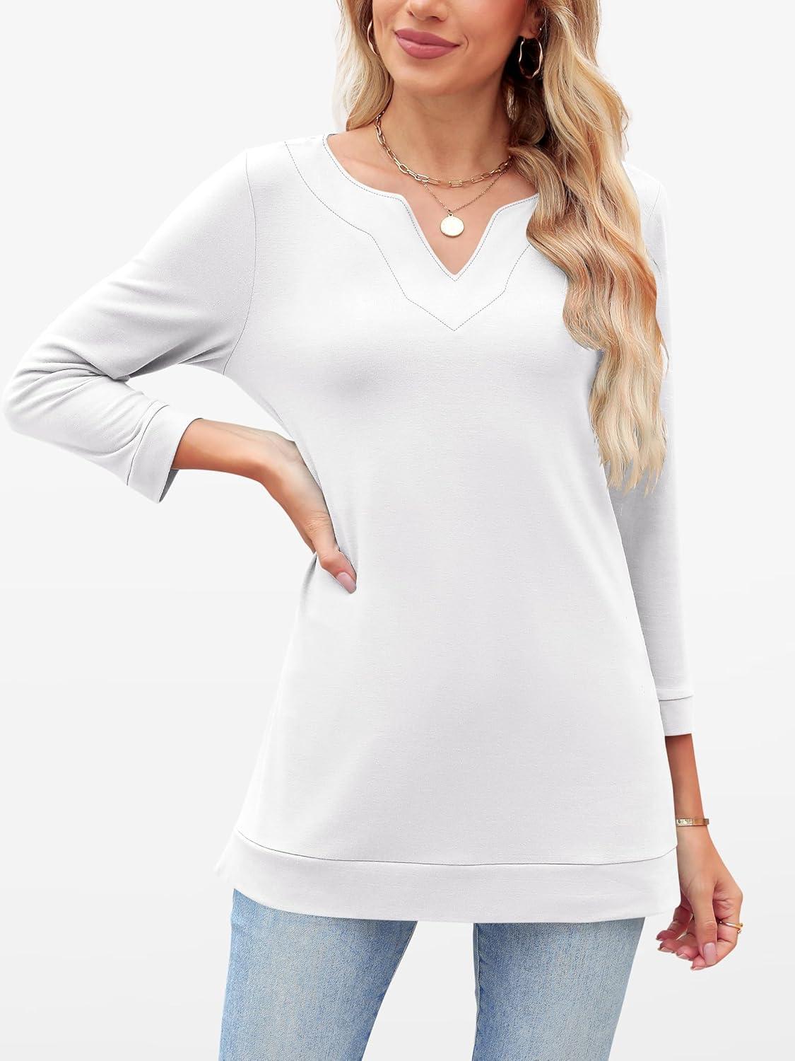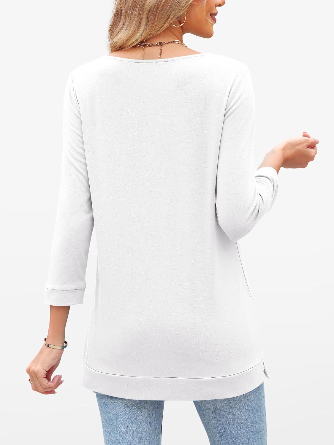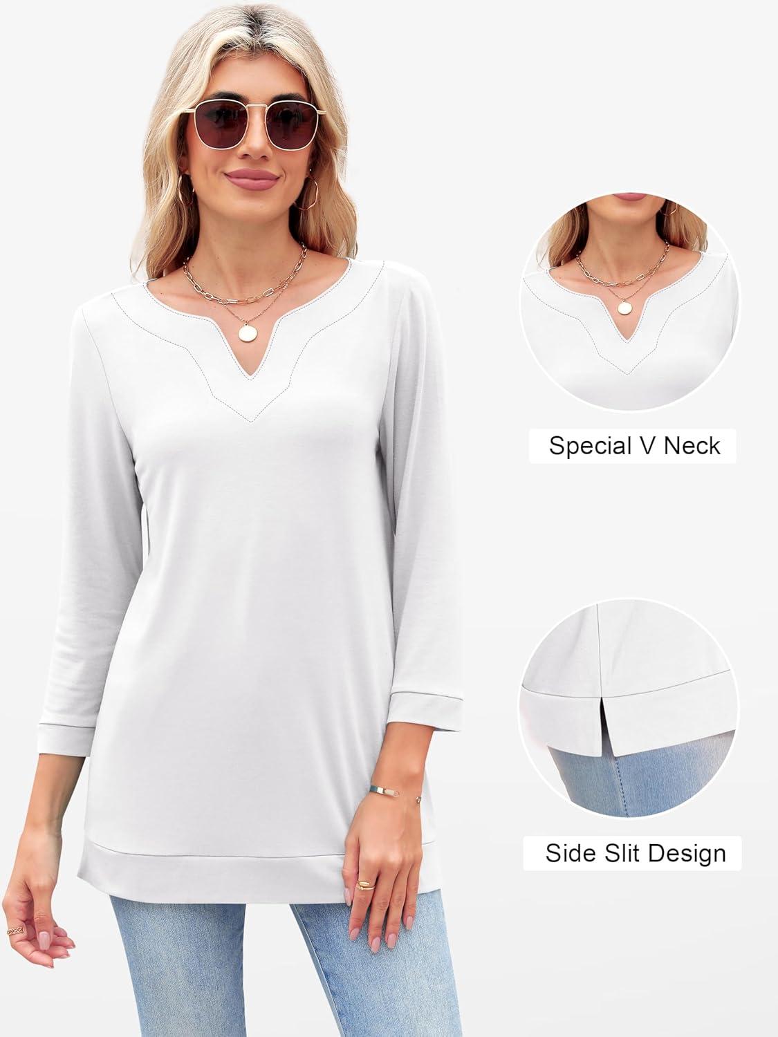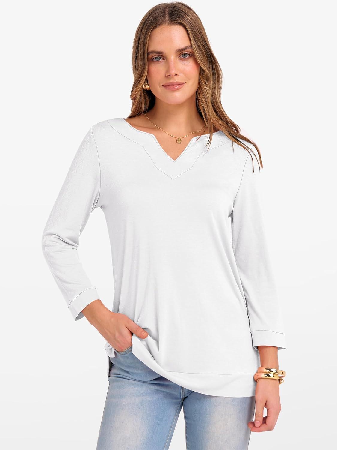 ANRABESS Womens 3/4 Length Sleeve Tops V Neck Basic Tee Shirts 2025 Spring Summer Dressy Casual Tunic Blouses Outfits(White)