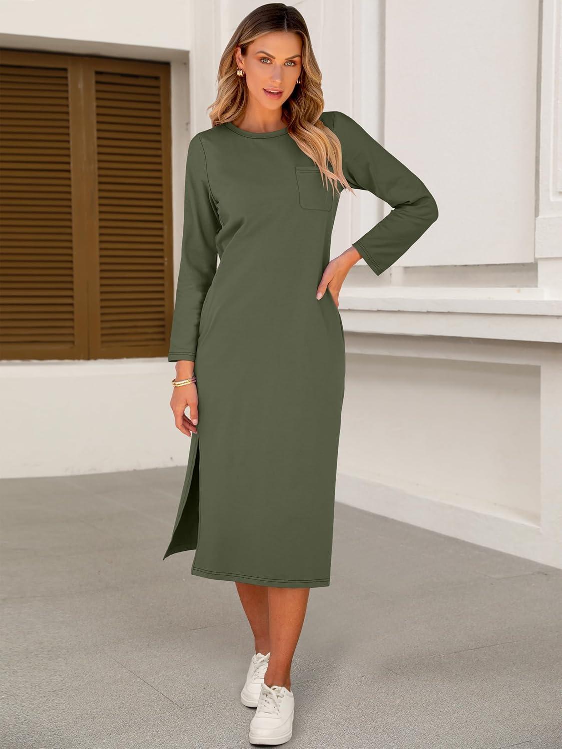 imageANRABESS Womens 34 Long Sleeve Striped Slit Midi T Shirt Dresses with Pockets 2025 Dressy Casual Fall Fashion Travel OutfitsArmy Green