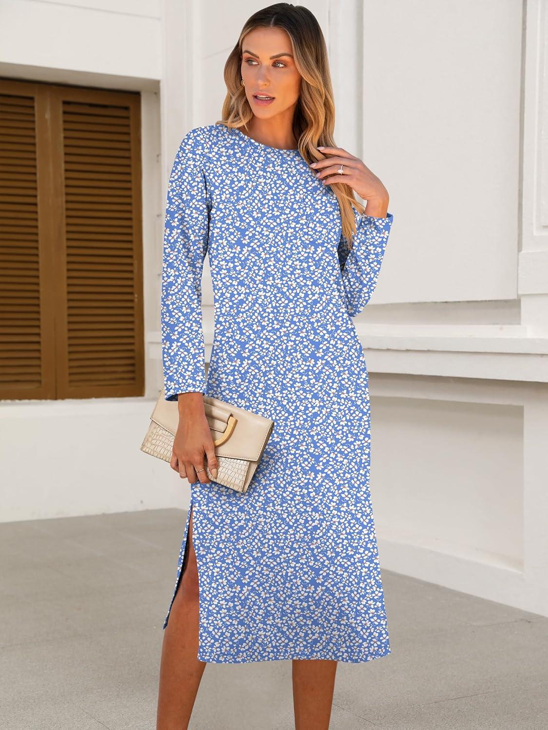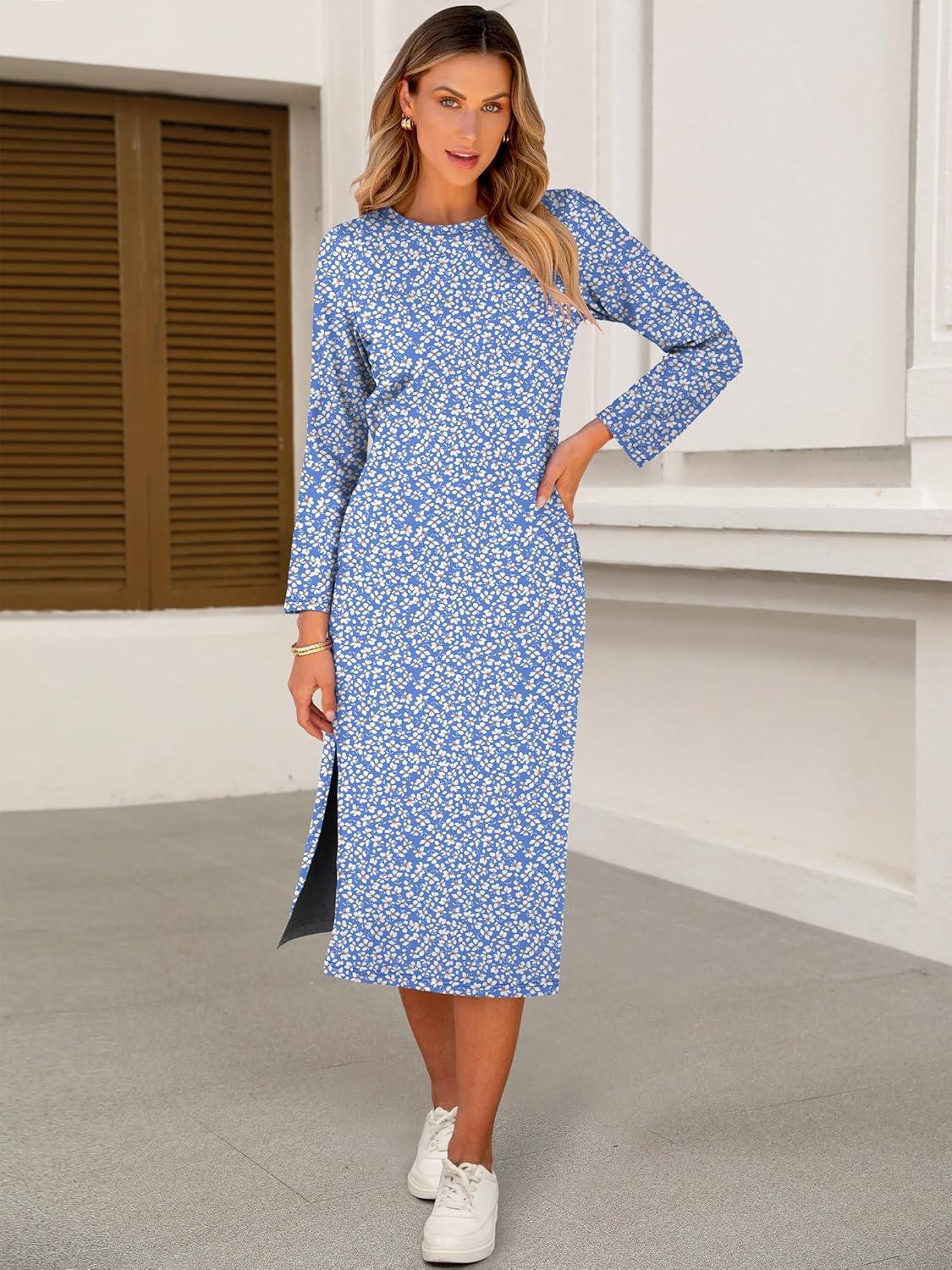 ANRABESS Womens 3/4 Long Sleeve Striped Slit Midi T Shirt Dresses with Pockets 2025 Dressy Casual Fall Fashion Travel Outfits(Floral Blue)