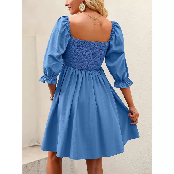 ANRABESS Womens 3/4 Puff Sleeve Square Neck Smocked Babydoll Dress Cute A Line Flowy Short Mini Dress(Blue)