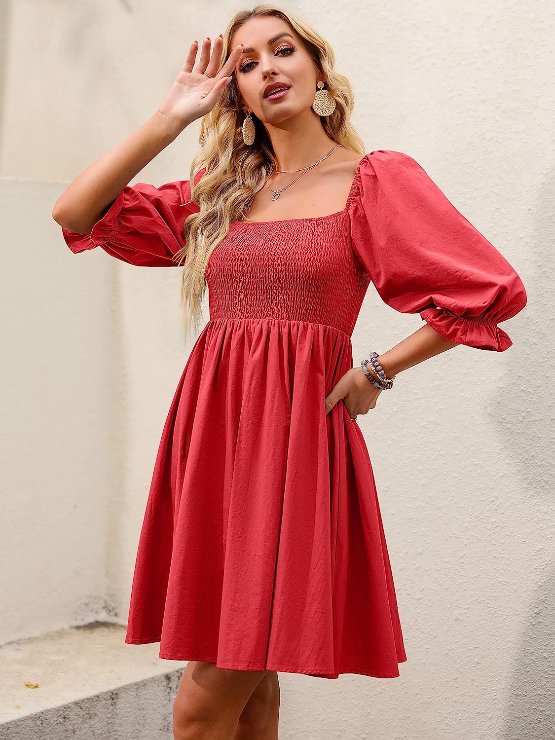 ANRABESS Womens 3/4 Puff Sleeve Square Neck Smocked Babydoll Dress Cute A Line Flowy Short Mini Dress(Red)