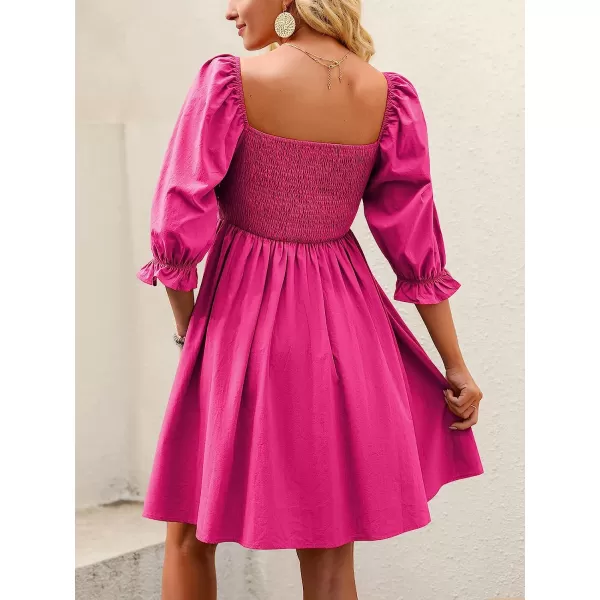 ANRABESS Womens 3/4 Puff Sleeve Square Neck Smocked Babydoll Dress Cute A Line Flowy Short Mini Dress(Rose)
