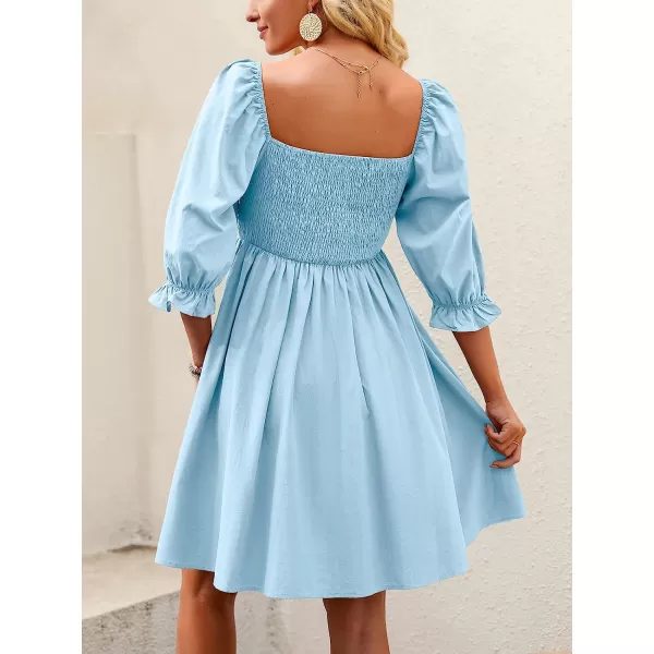 Features – Square Neck, Puff 3/4 Sleeve with Elastic Cuffs, Smocked bust, High Waist, Mini Length,Pull-on styling,Smocked bodice and elastic cuffs.