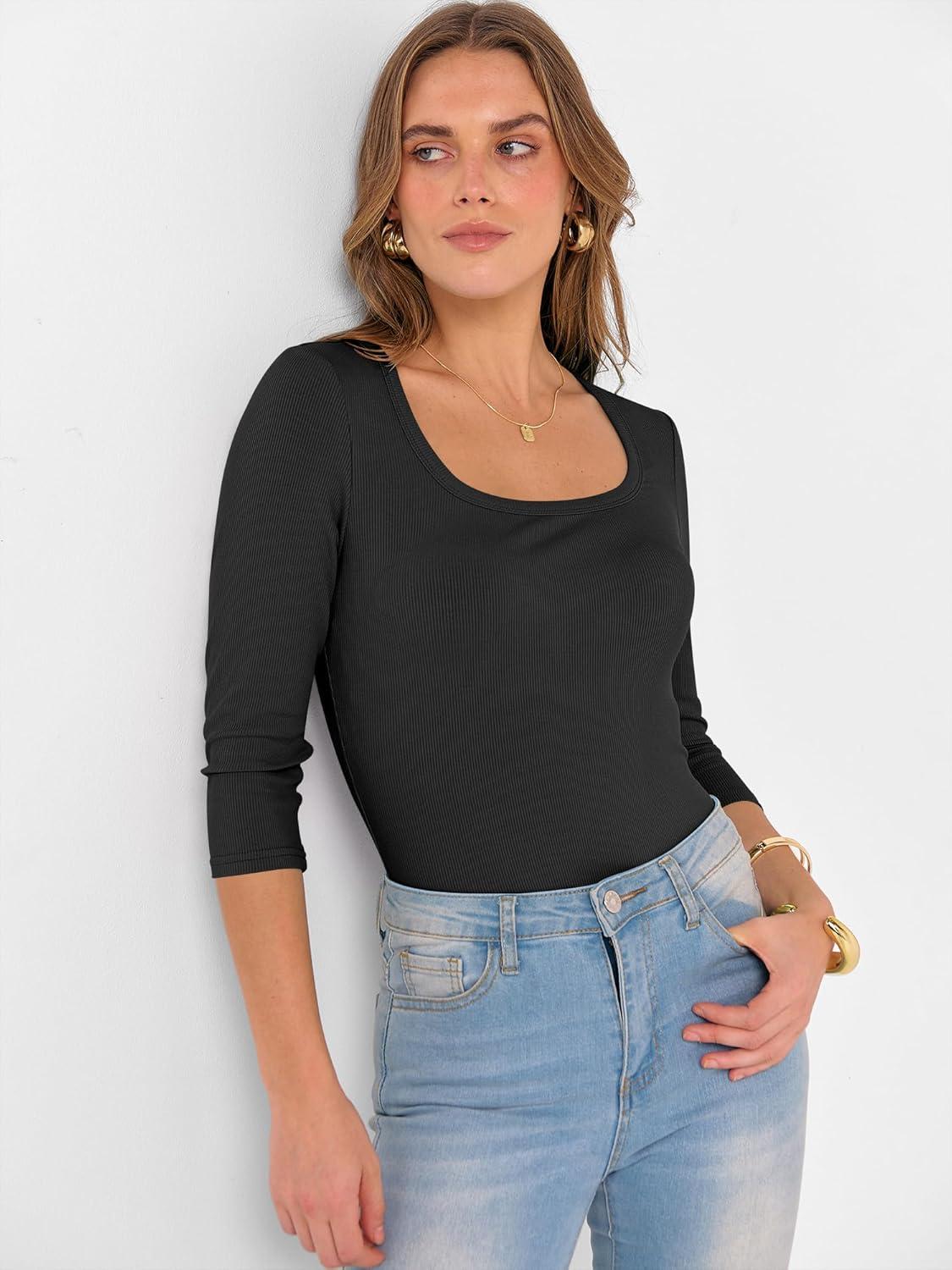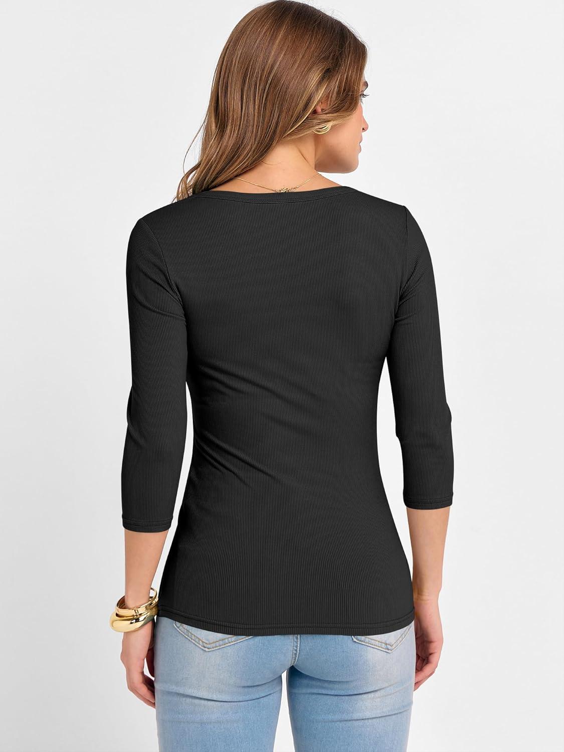 ANRABESS Womens 3/4 Sleeve Scoop Neck Tops Ribbed Knit Slim Fitted Casual Basic Tee Shirts 2025 Fall Trendy Going Out T-Shirt(Black)