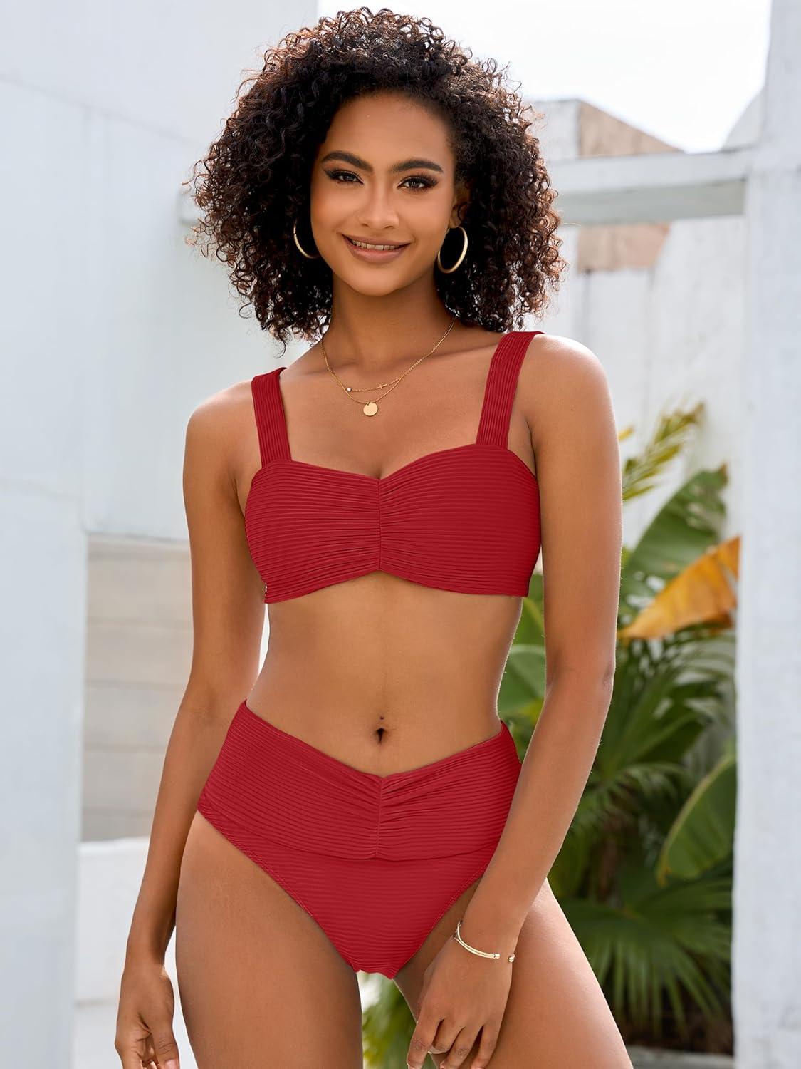 ANRABESS Womens Bikini Set Tummy Control Push Up Two Piece Swimsuit 2025 Front Ruched Adjustable Strap Mid Waist Bathing Suit(Red)