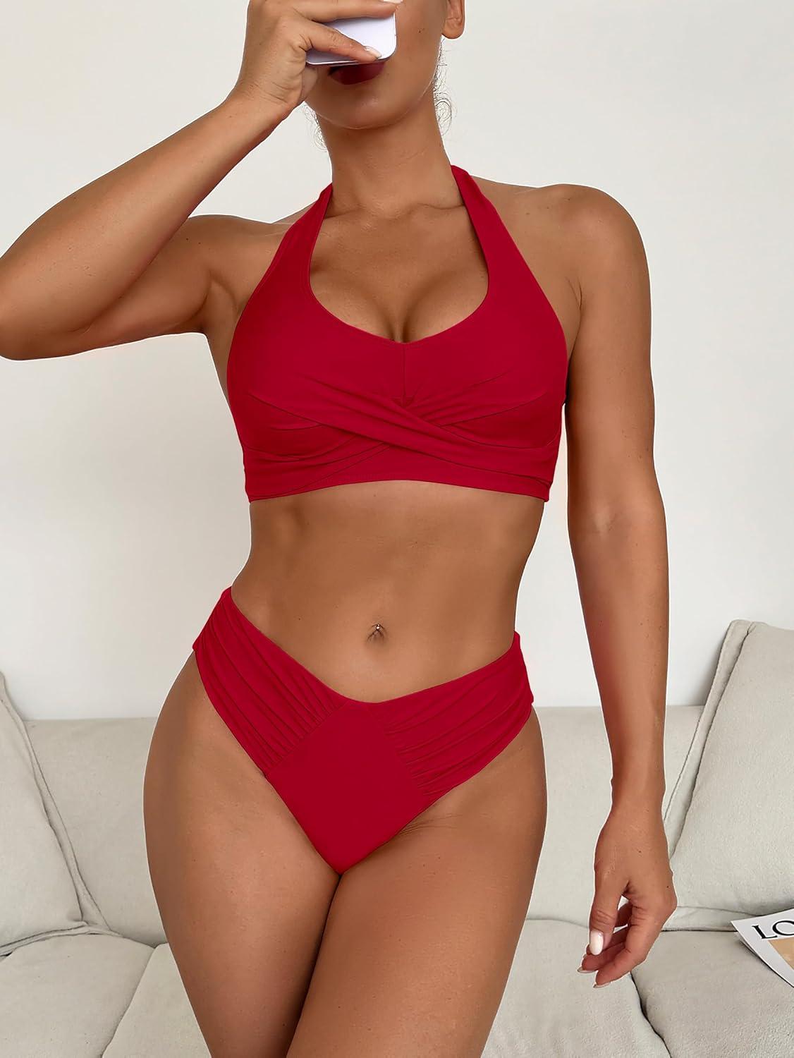 ANRABESS Womens Bikini Sets Two Piece Swimsuits High Waisted Halter Twist Front Bathing Suit 2026 Summer Beach Swimwear(Red)