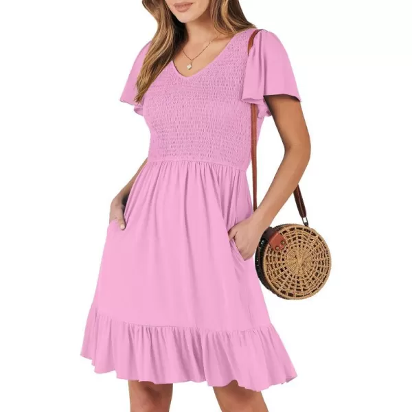 ANRABESS Women’s Summer Casual Flowy Smocked V Neck Flutter Sleeve Beach Mini Dress with Pockets(Pink)