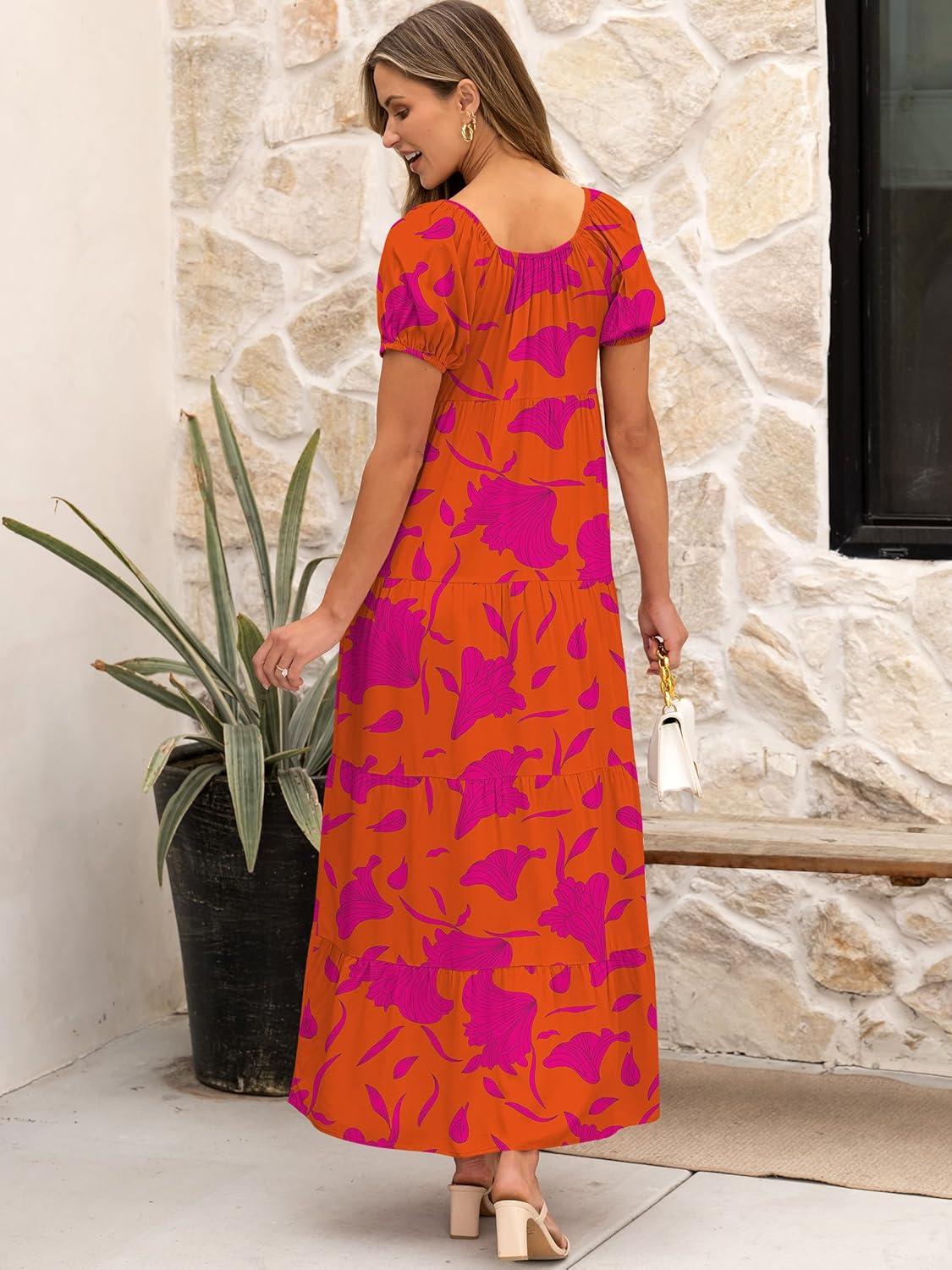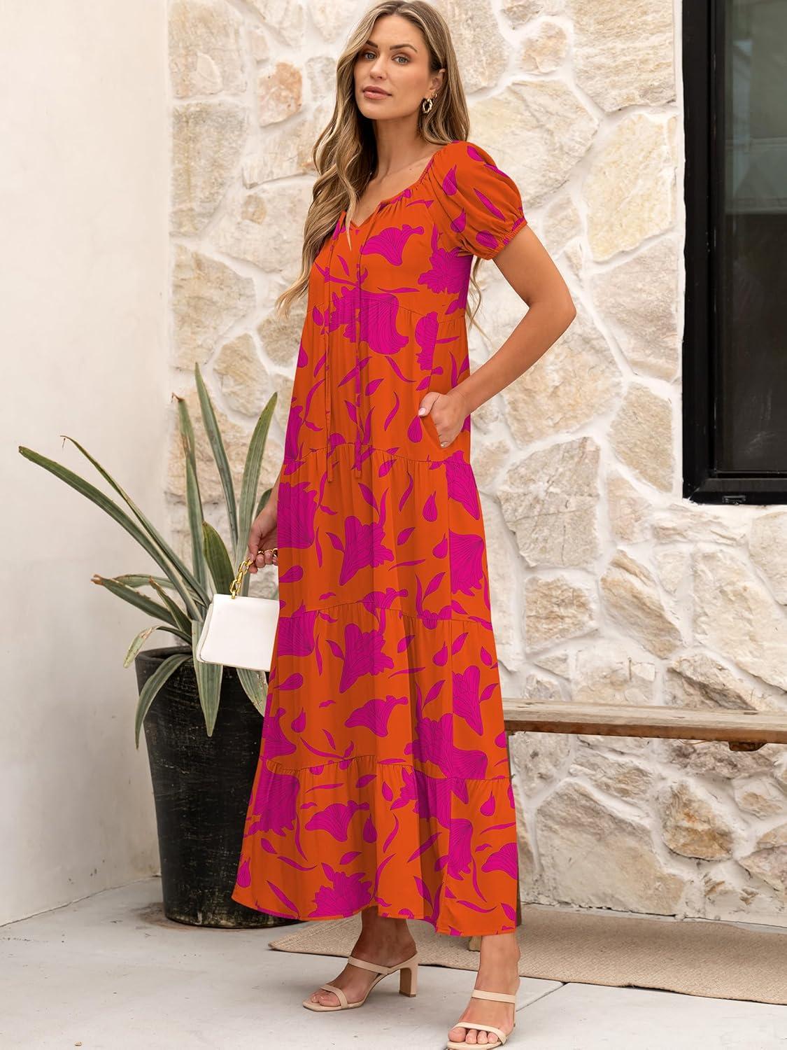 ANRABESS Women's Boho Maxi Dresses 2025 Summer Casual Floral Puff Short Sleeve Tie Front Flowy Swing Tiered Long Beach Dress(Orange Rose Floral)