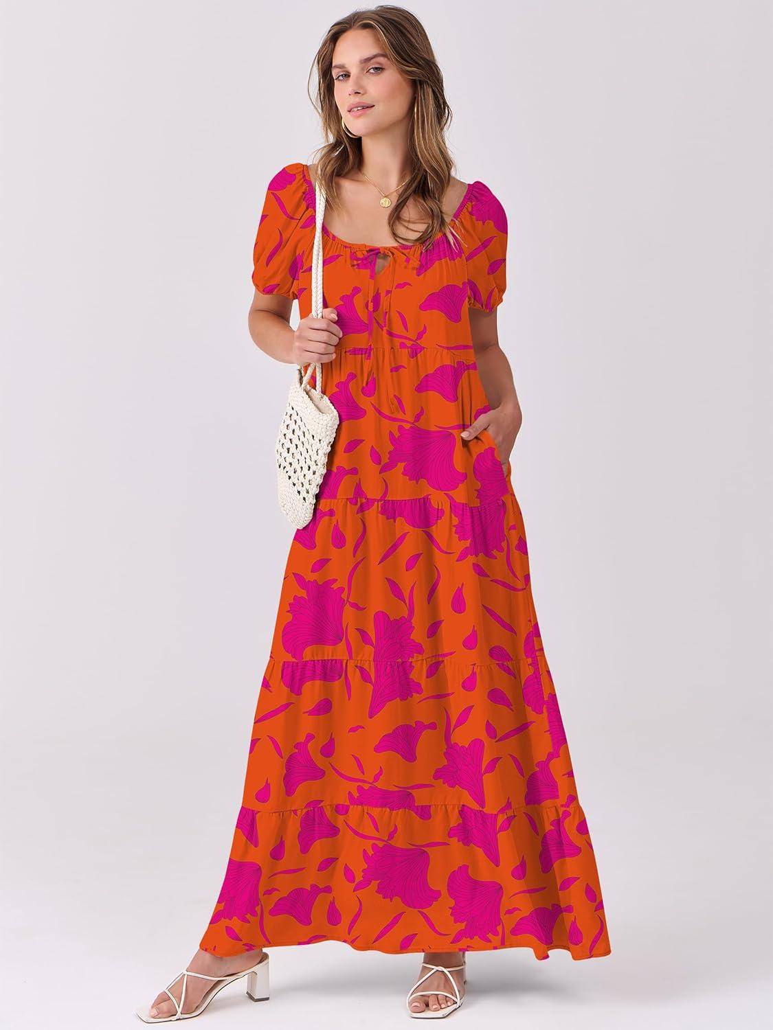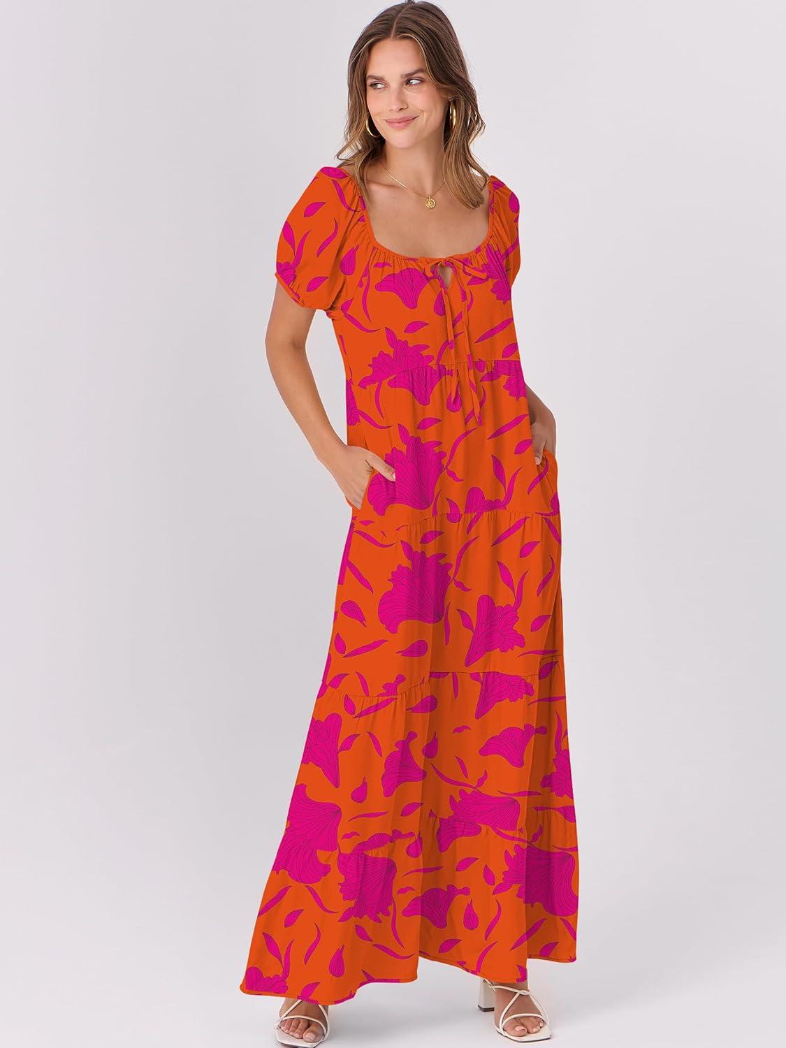 ANRABESS Women’s Boho Maxi Dresses 2025 Summer Casual Floral Puff Short Sleeve Tie Front Flowy Swing Tiered Long Beach Dress(Orange Rose Floral)
