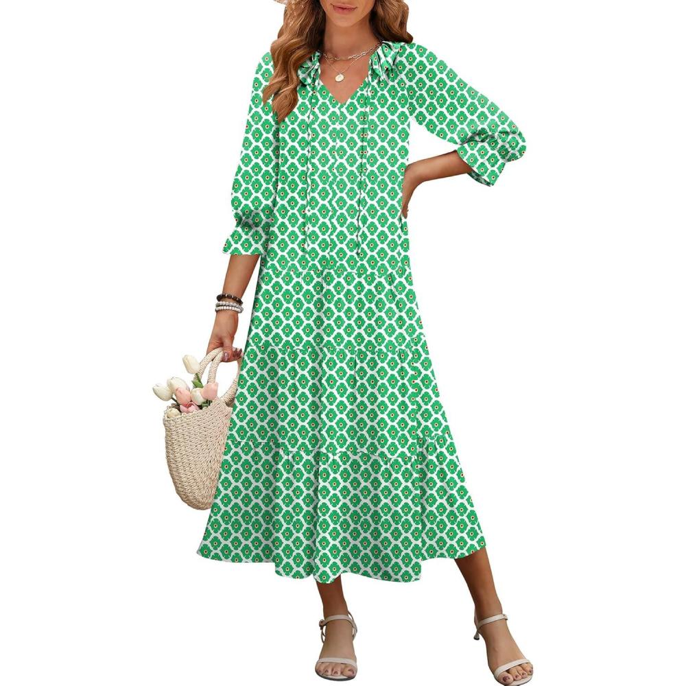 ANRABESS Women’s Boho Maxi Dresses 2025 Summer Casual V Neck Puff Sleeve Floral Tiered Flowy Swing Beach Vacation Long Dress(Floral Green White)