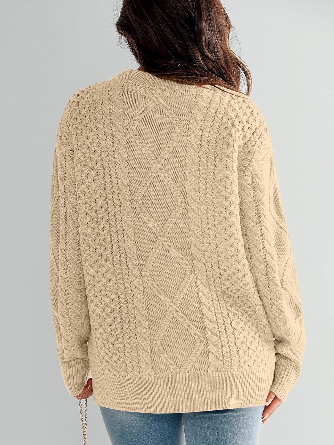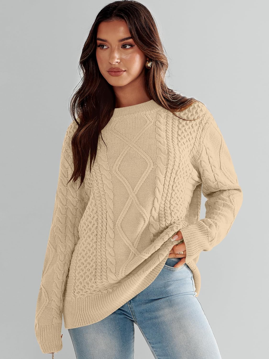ANRABESS Women’s Cable Knit Sweater Winter Fashion Oversized Long Sleeve Crewneck Chunky Vintage Casual Loose Pullover Tops(Deep Apricot)