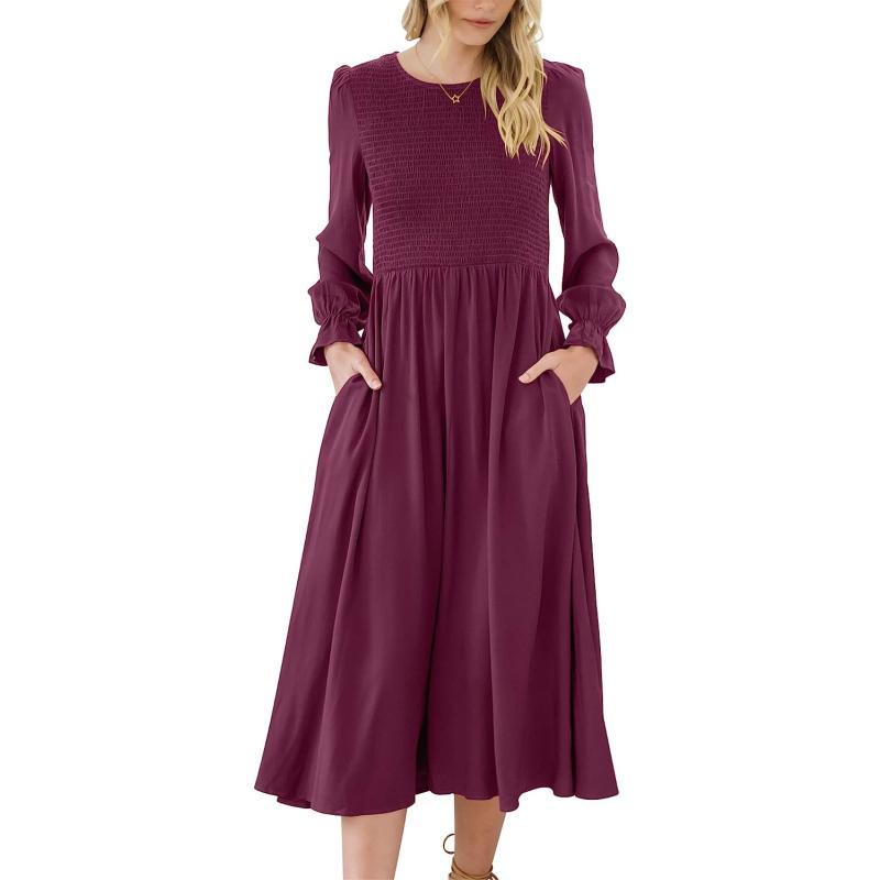 Boho dress:Long Puff Sleeve, classical solid color, ruched bodice design, keyhole closure at back, elastic waist with a floaty midi skirt.