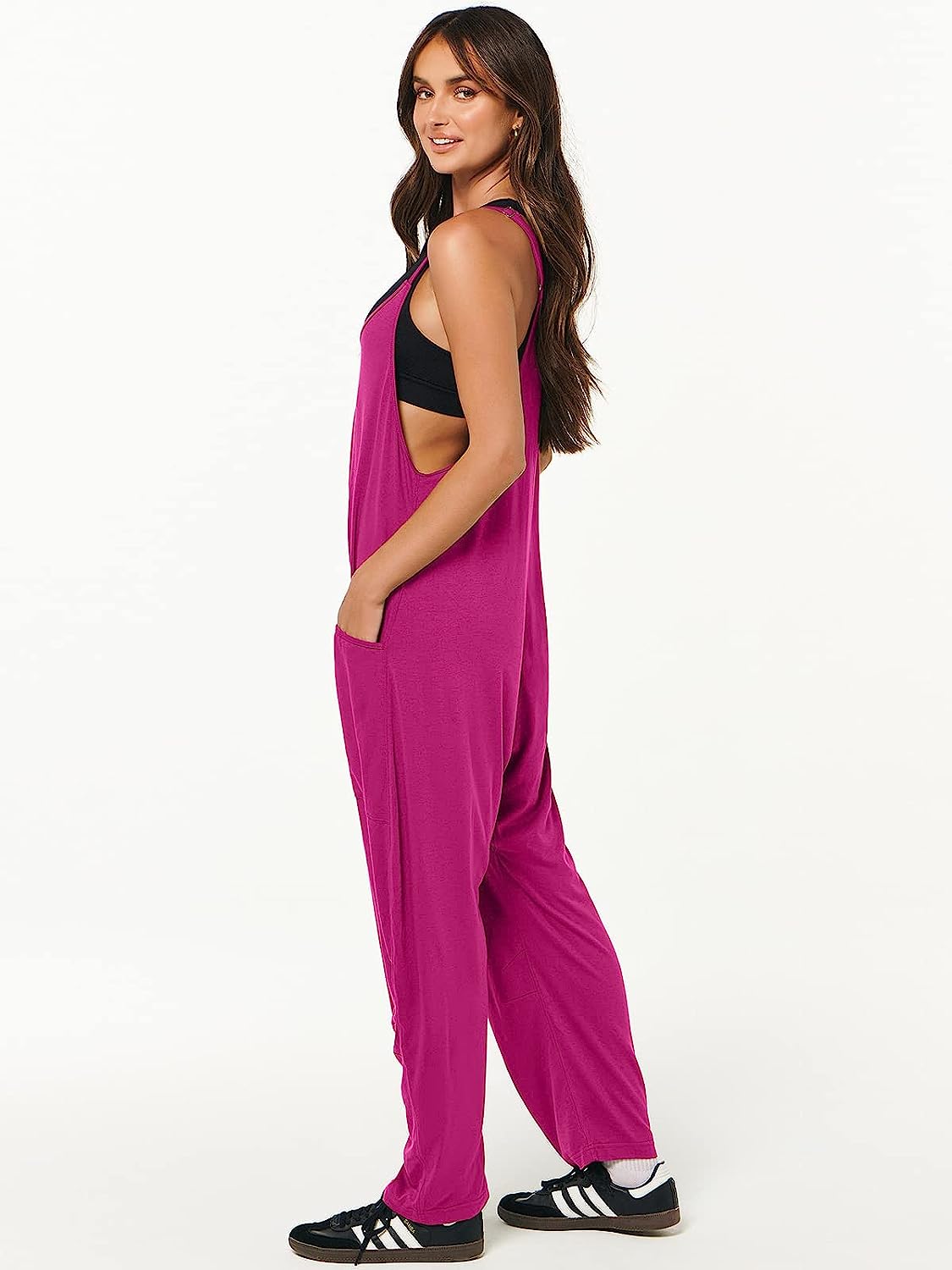ANRABESS Women's Casual Loose Sleeveless Jumpsuits Adjustbale Spaghetti Strap V Neck Harem Long Pants Overalls with Pockets(Hot Pink)