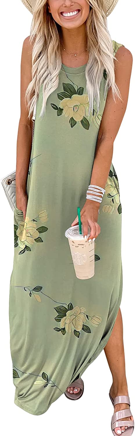 ANRABESS Women's Casual Loose Sundress Long Dress Sleeveless Split Maxi Dresses Summer Beach Dress with Pockets(Floral Green)