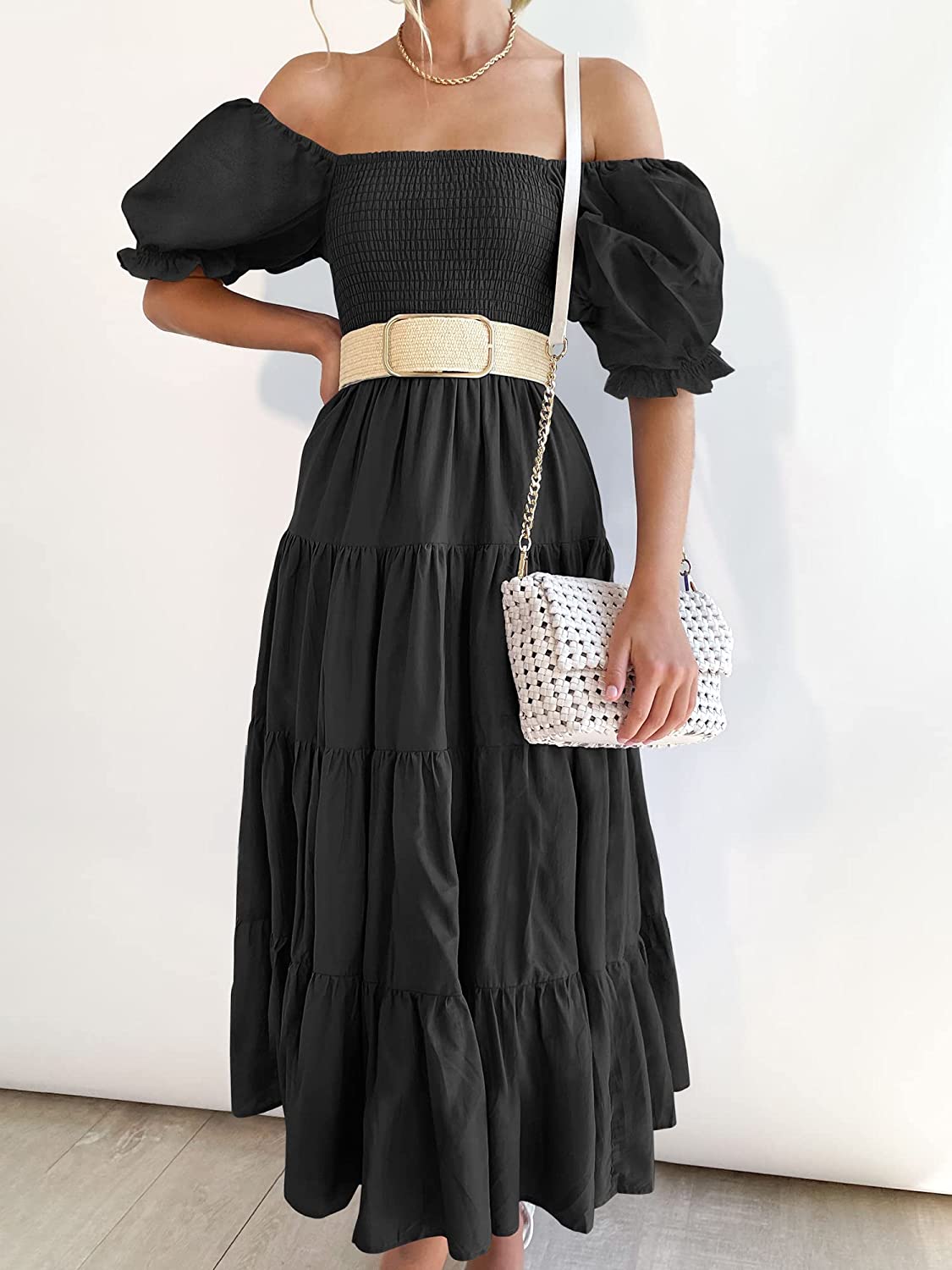 ANRABESS Women’s Casual Summer Midi Dress Puffy Short Sleeve Square Neck Smocked Tiered Boho Dresses(Black)