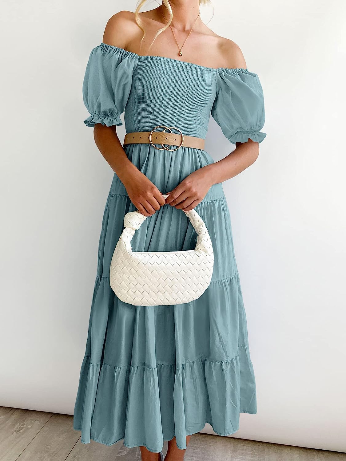 ANRABESS Women's Casual Summer Midi Dress Puffy Short Sleeve Square Neck Smocked Tiered Boho Dresses(Light Blue)