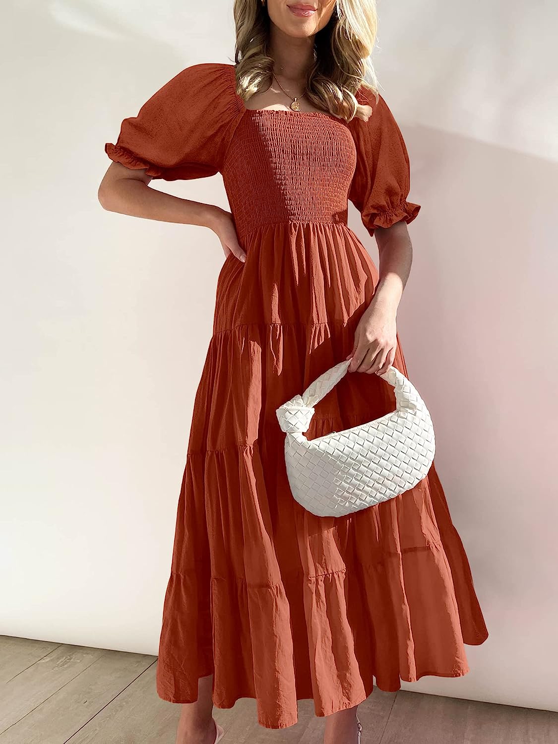 ANRABESS Women’s Casual Summer Midi Dress Puffy Short Sleeve Square Neck Smocked Tiered Boho Dresses(Rust)