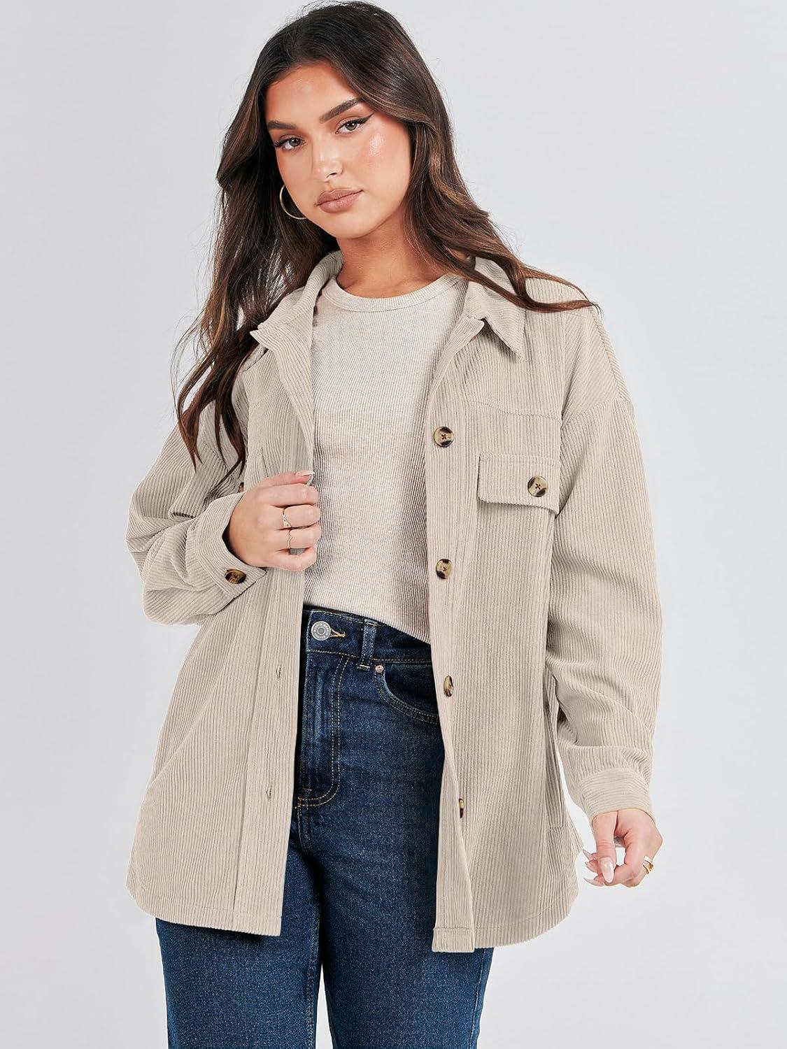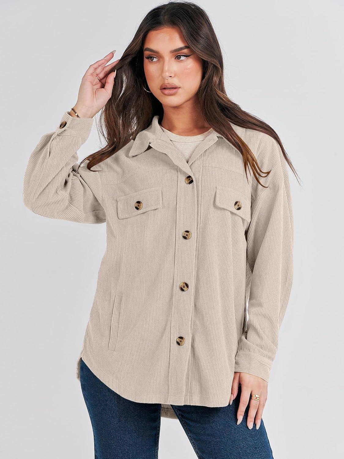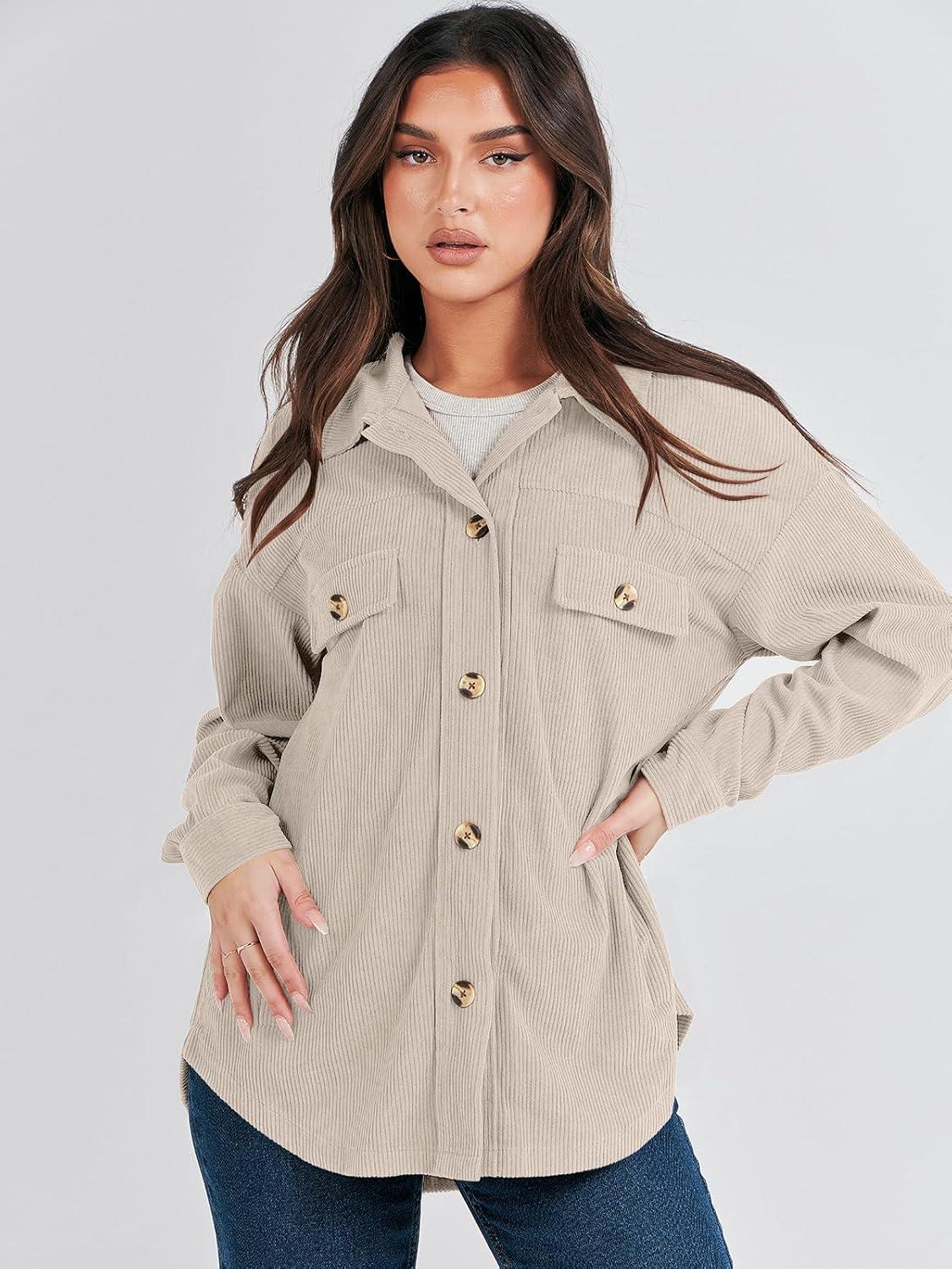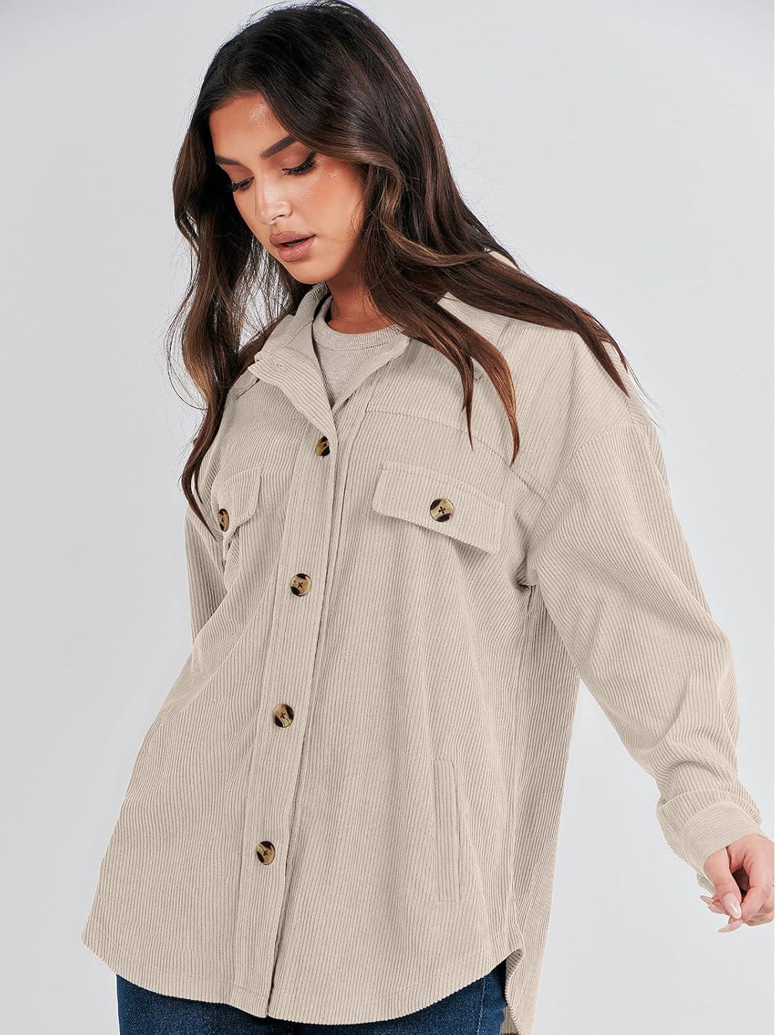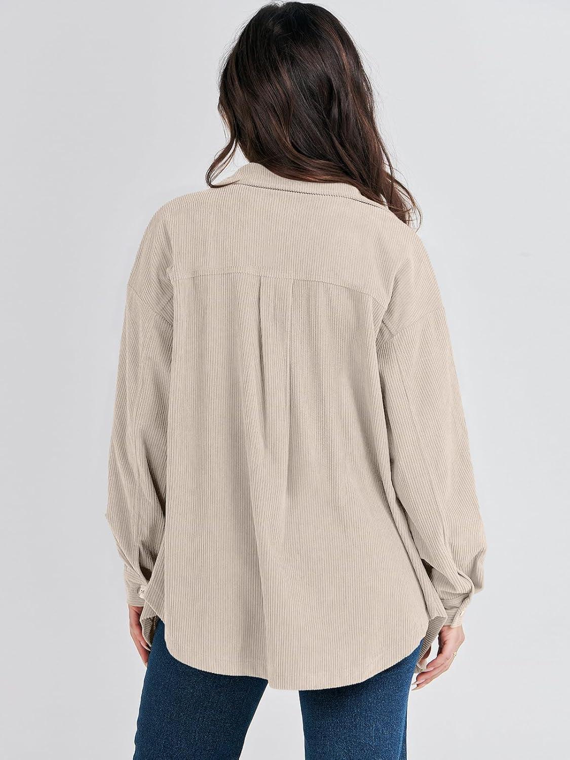 ANRABESS Womens Corduroy Shacket Button Down Shirts Oversized Long Sleeve Casual Cardigan Jacket 2025 Fall Fashion Clothes(Beige)