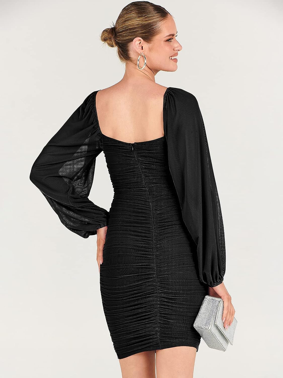 Design – sexy bodycon dress features a mesh puff long sleeve ,deep v neck,mini dress,ruched bodice,above knee length,great for the next events!