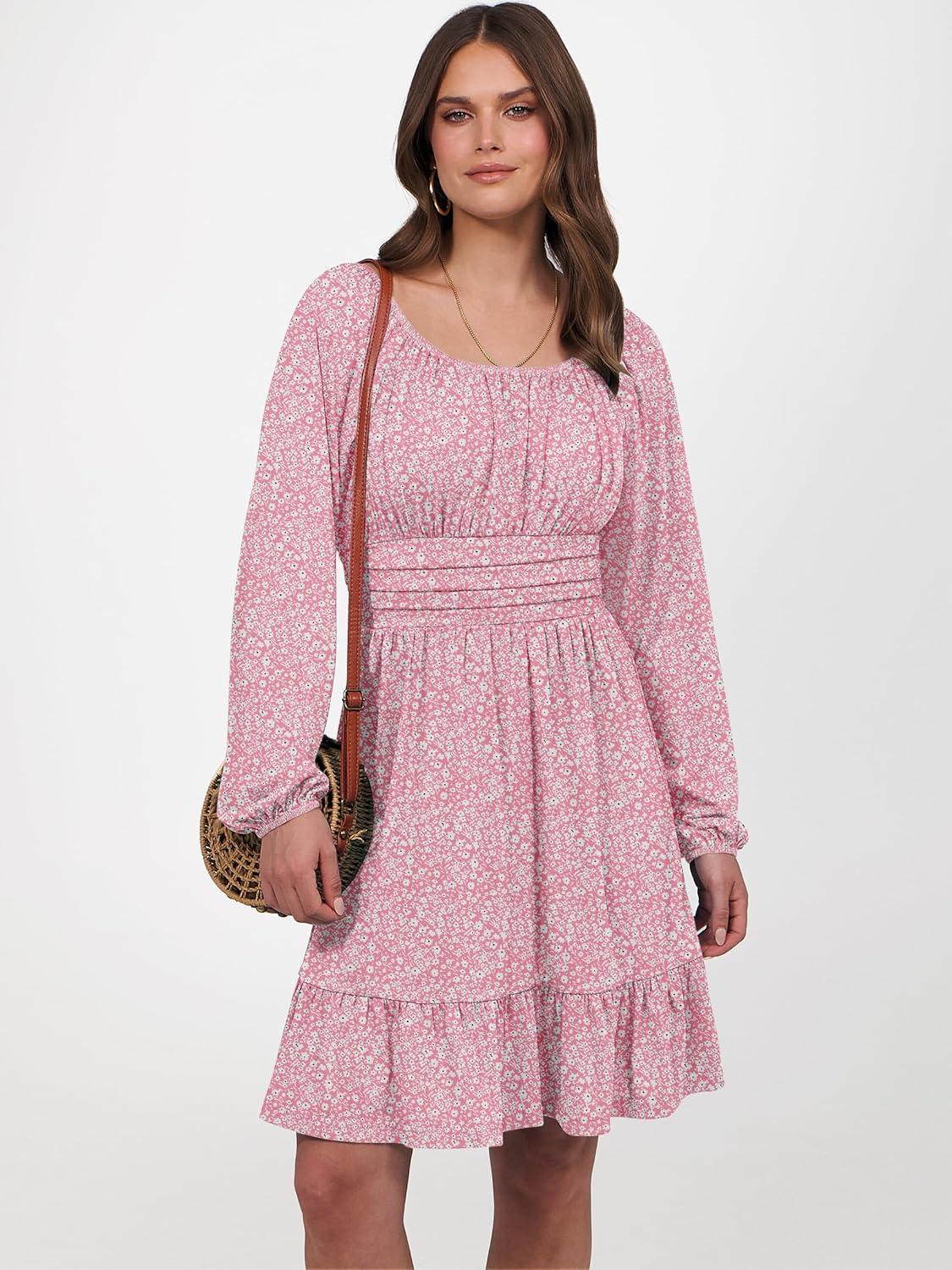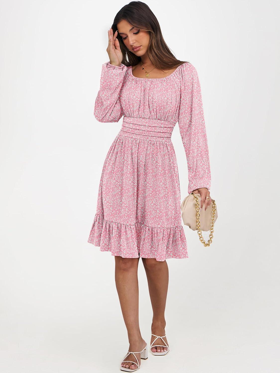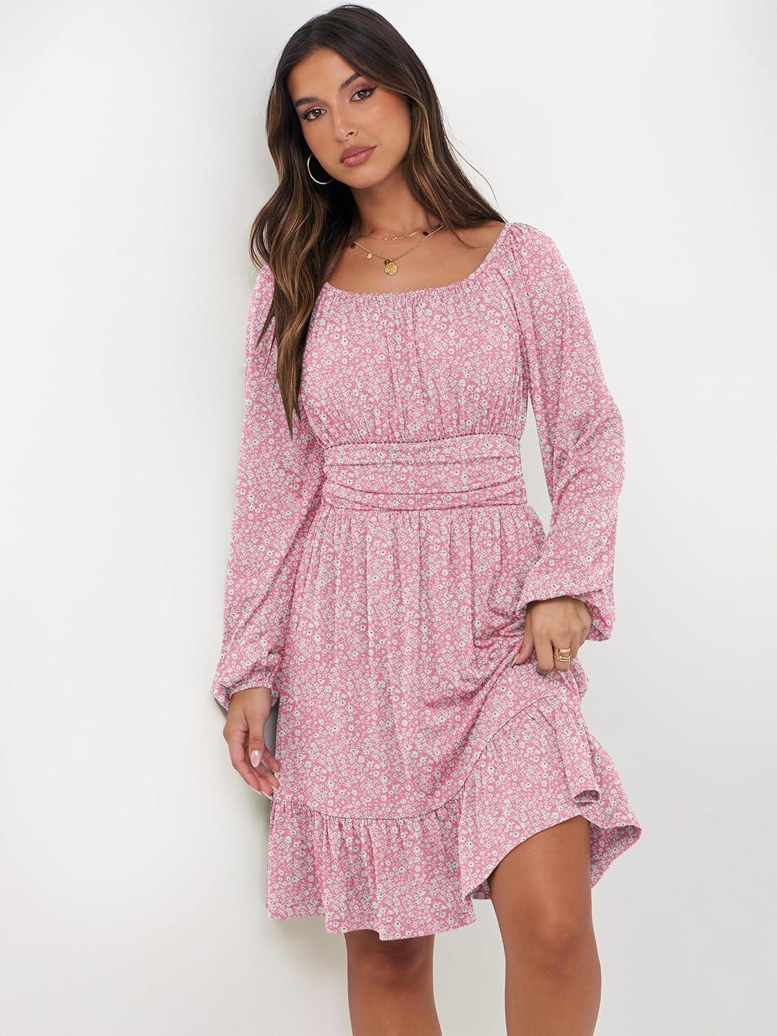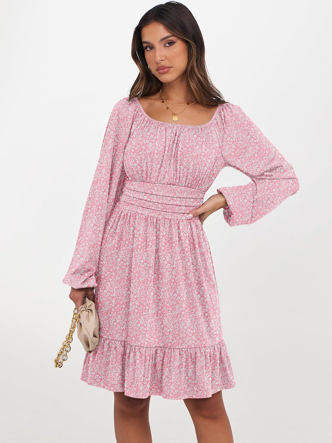 ANRABESS Womens Dress Long Lantern Sleeve Square Neck Elastic Waist Ruffle Flowy Swing A-Line Short Dresses 2025 Fall Fashion(Floral Pink)