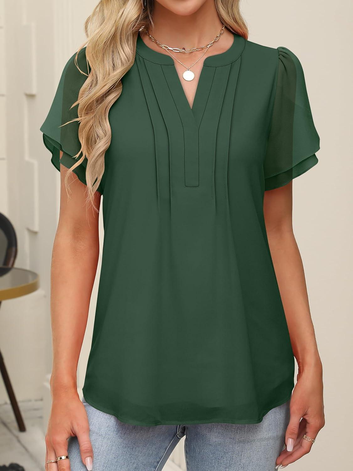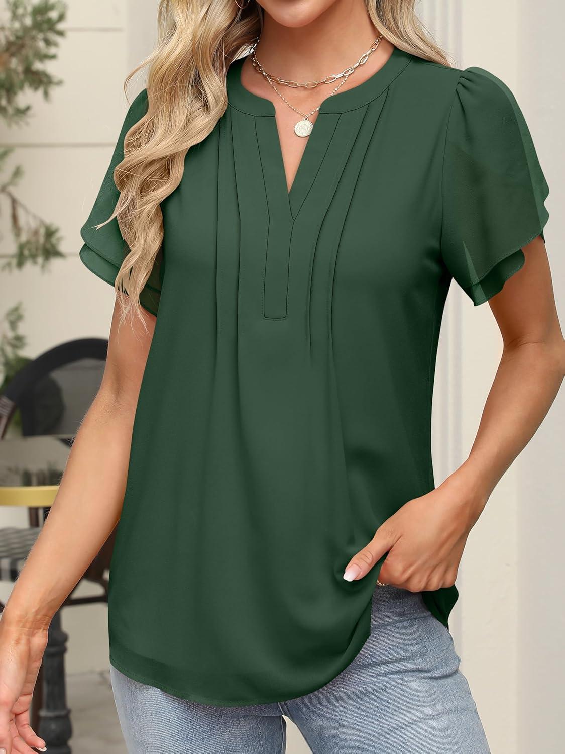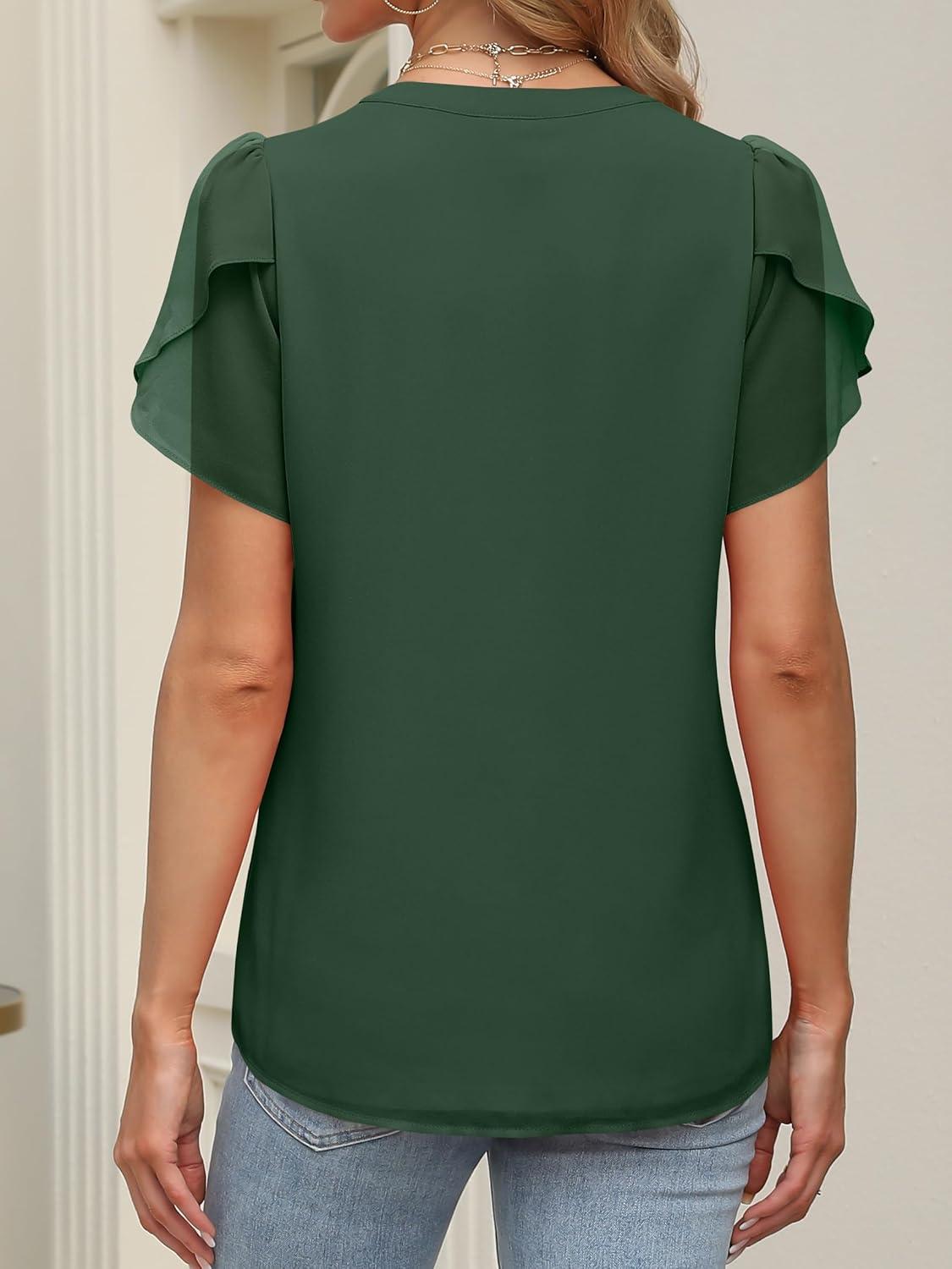 ANRABESS Womens Dressy Chiffon Blouses V Neck Petal Short Sleeve Shirts 2025 Summer Casual Business Office Work Tops(Army Green)