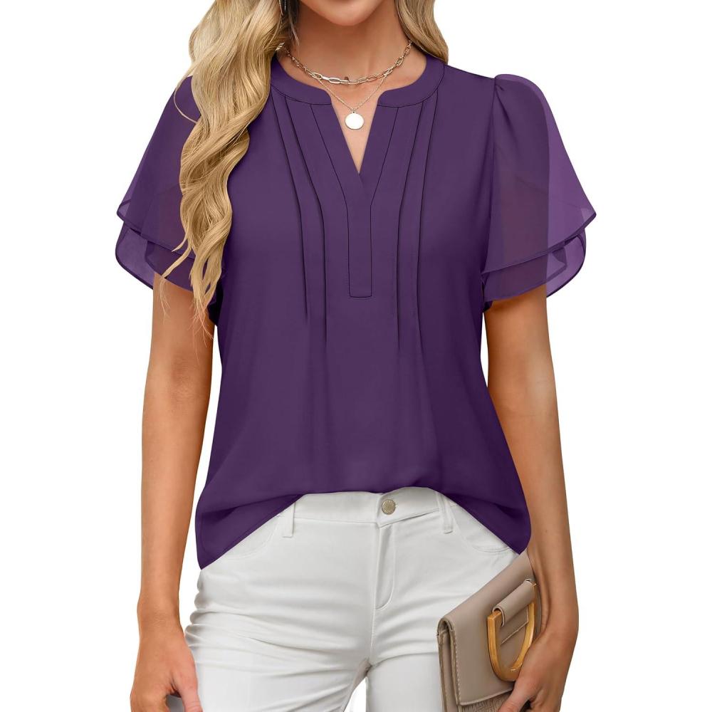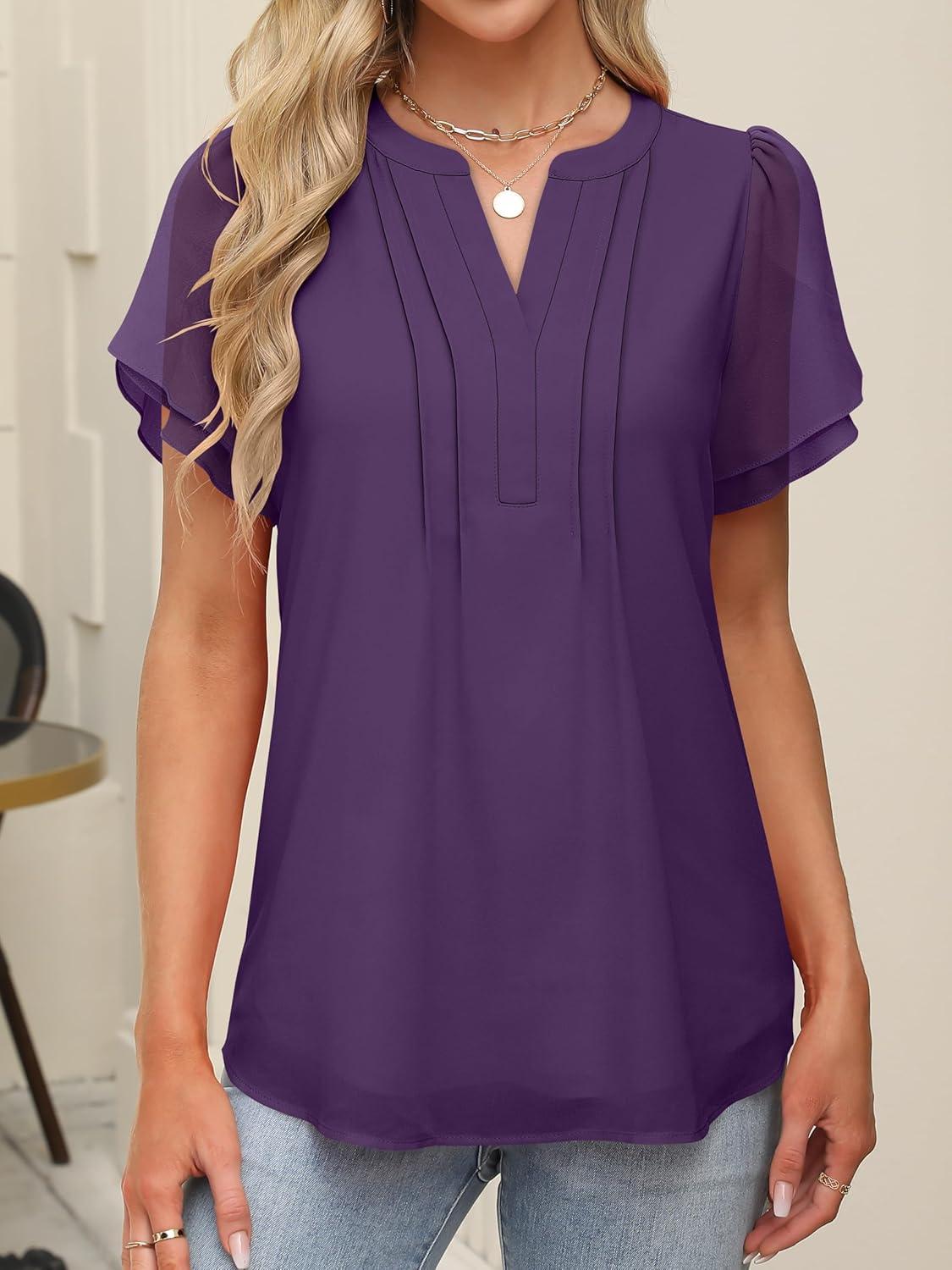 ANRABESS Womens Dressy Chiffon Blouses V Neck Petal Short Sleeve Shirts 2025 Summer Casual Business Office Work Tops(Deep Purple)