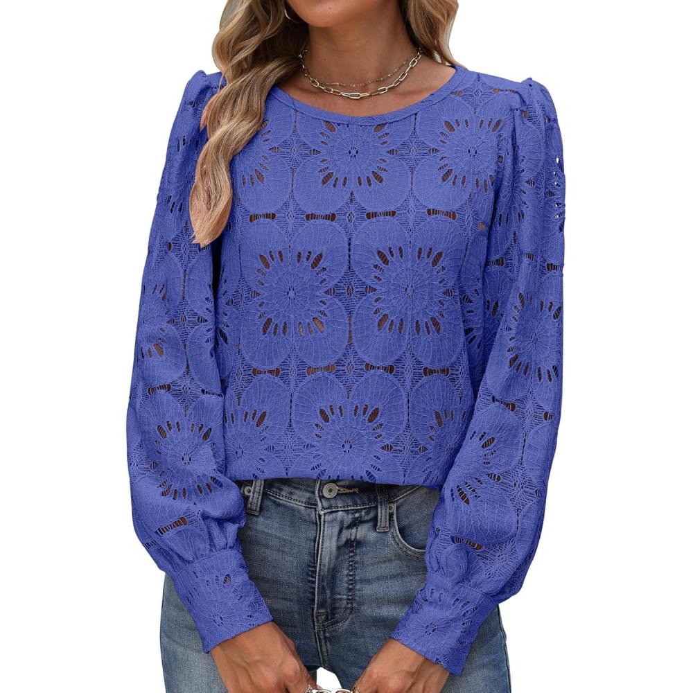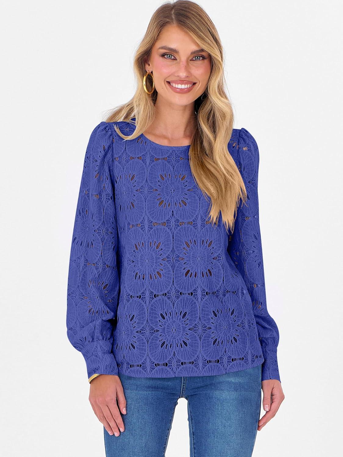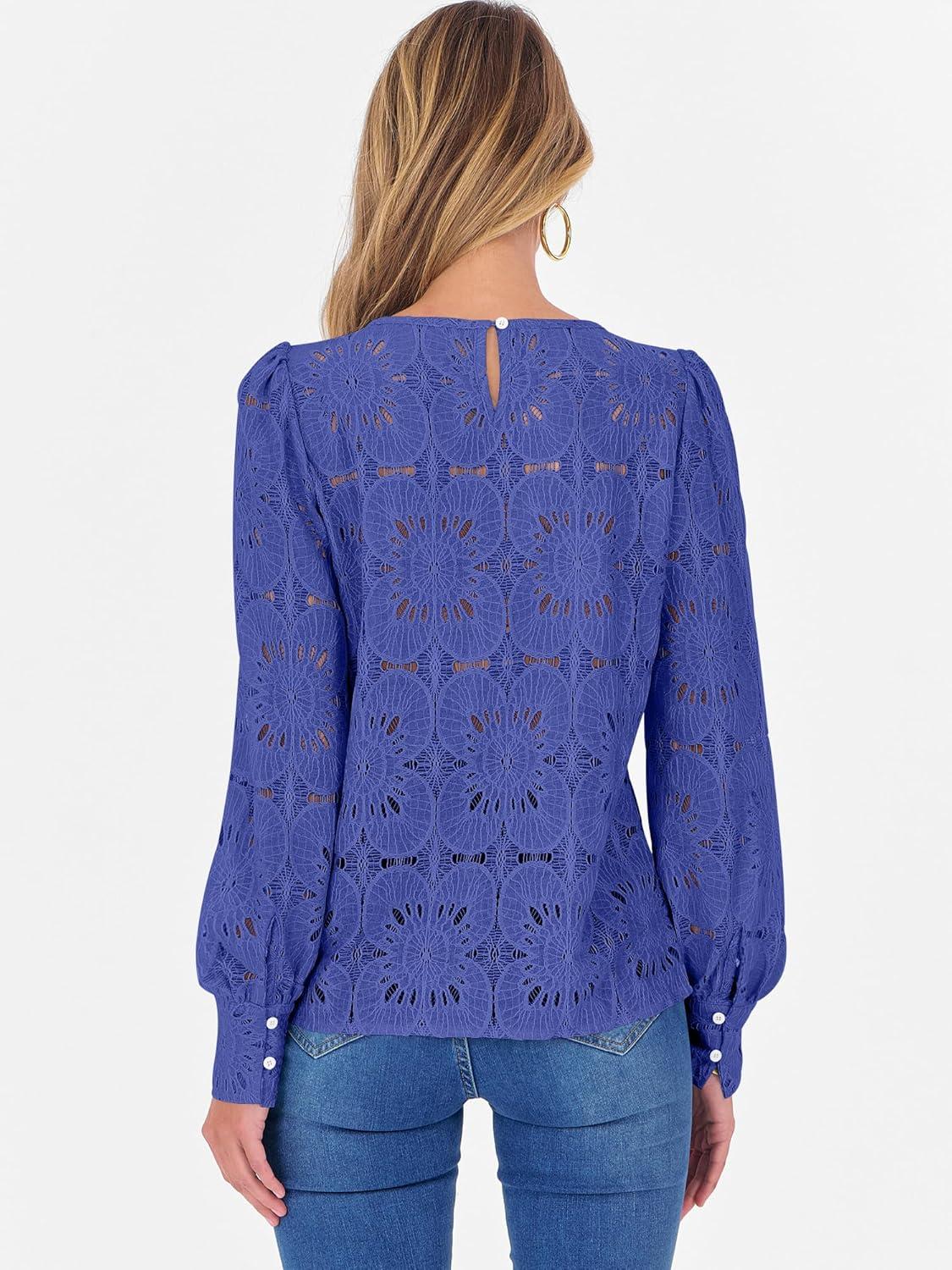 ANRABESS Womens Eyelet Long Sleeve Tops Business Casual Blouses Crochet Lace Shirts 2025 Fall Fashion Outfits(Navy Blue)