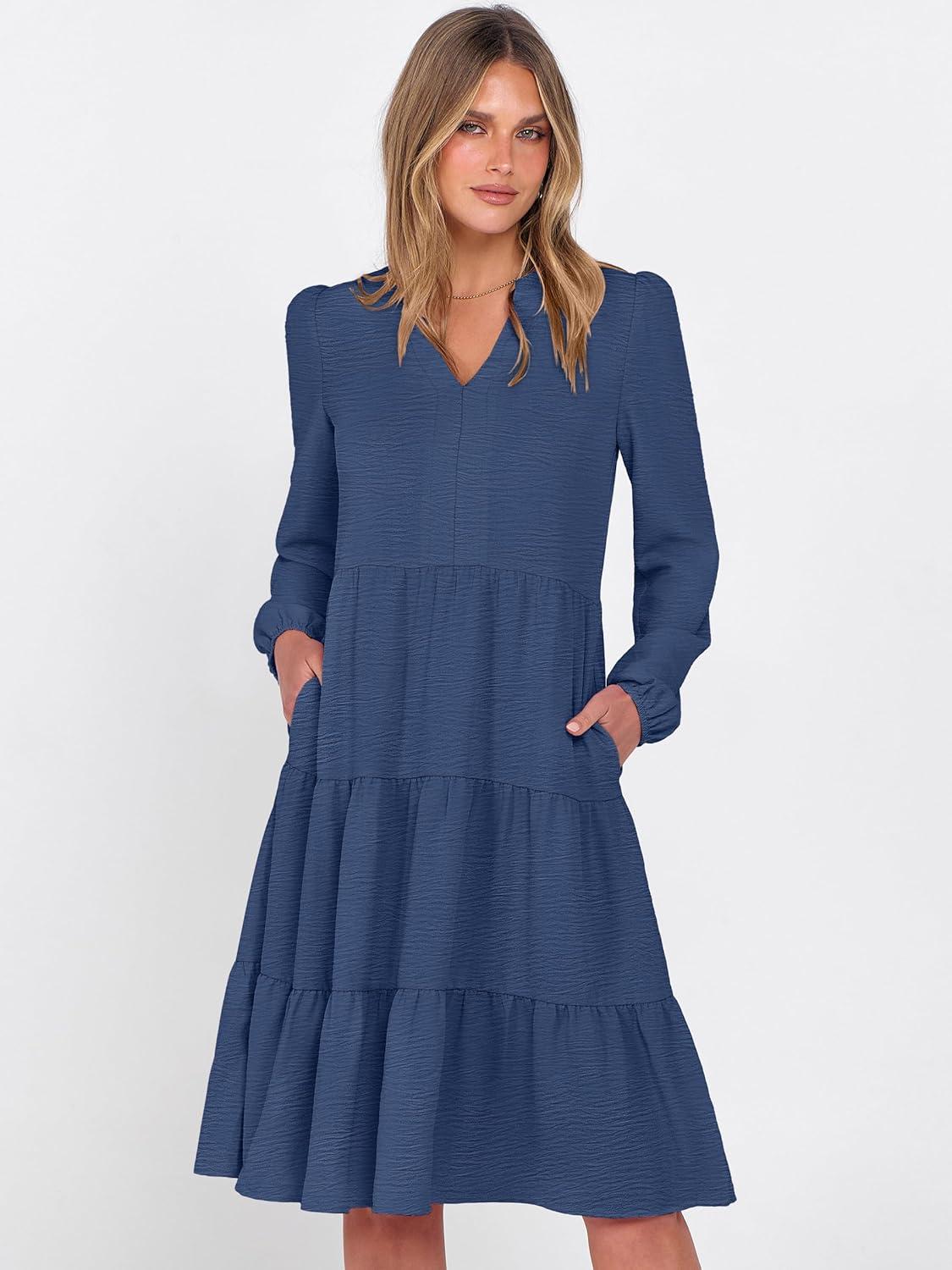 ANRABESS Womens Fall Midi Dresses Long Sleeve V Neck Swing Tiered Work Business Casual 2025 Flowy Beach Vacation Dress(Deep Blue)
