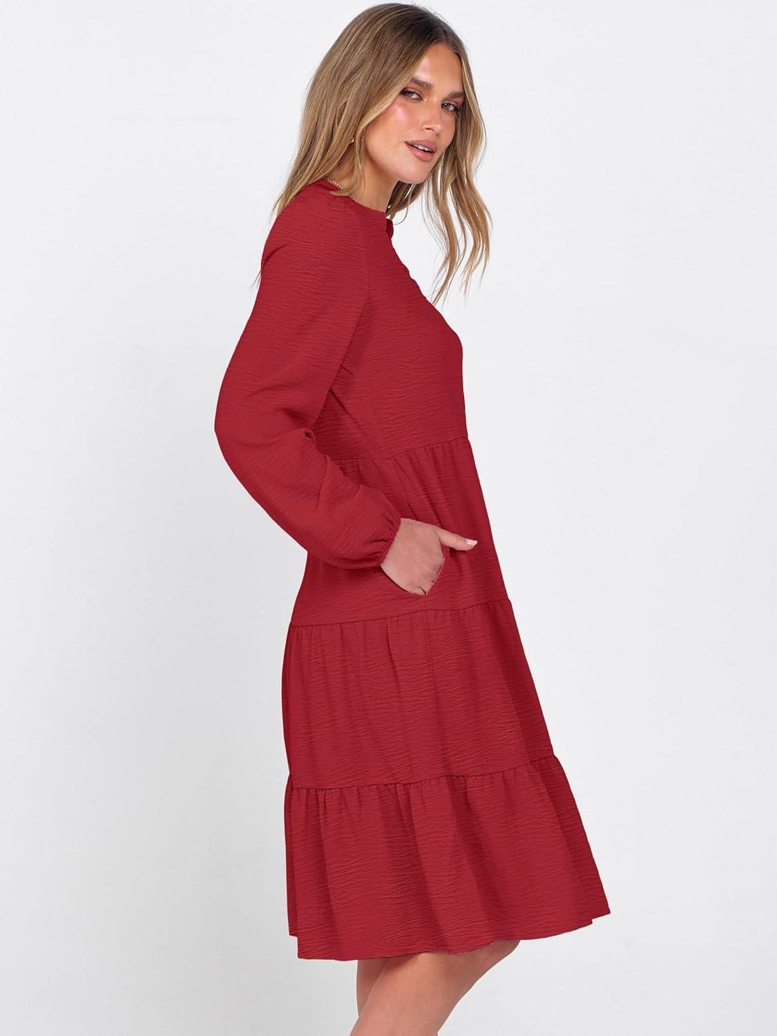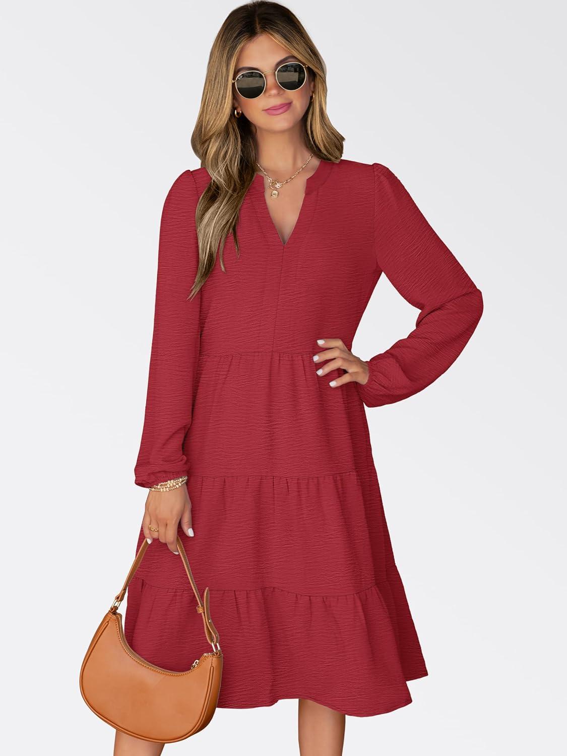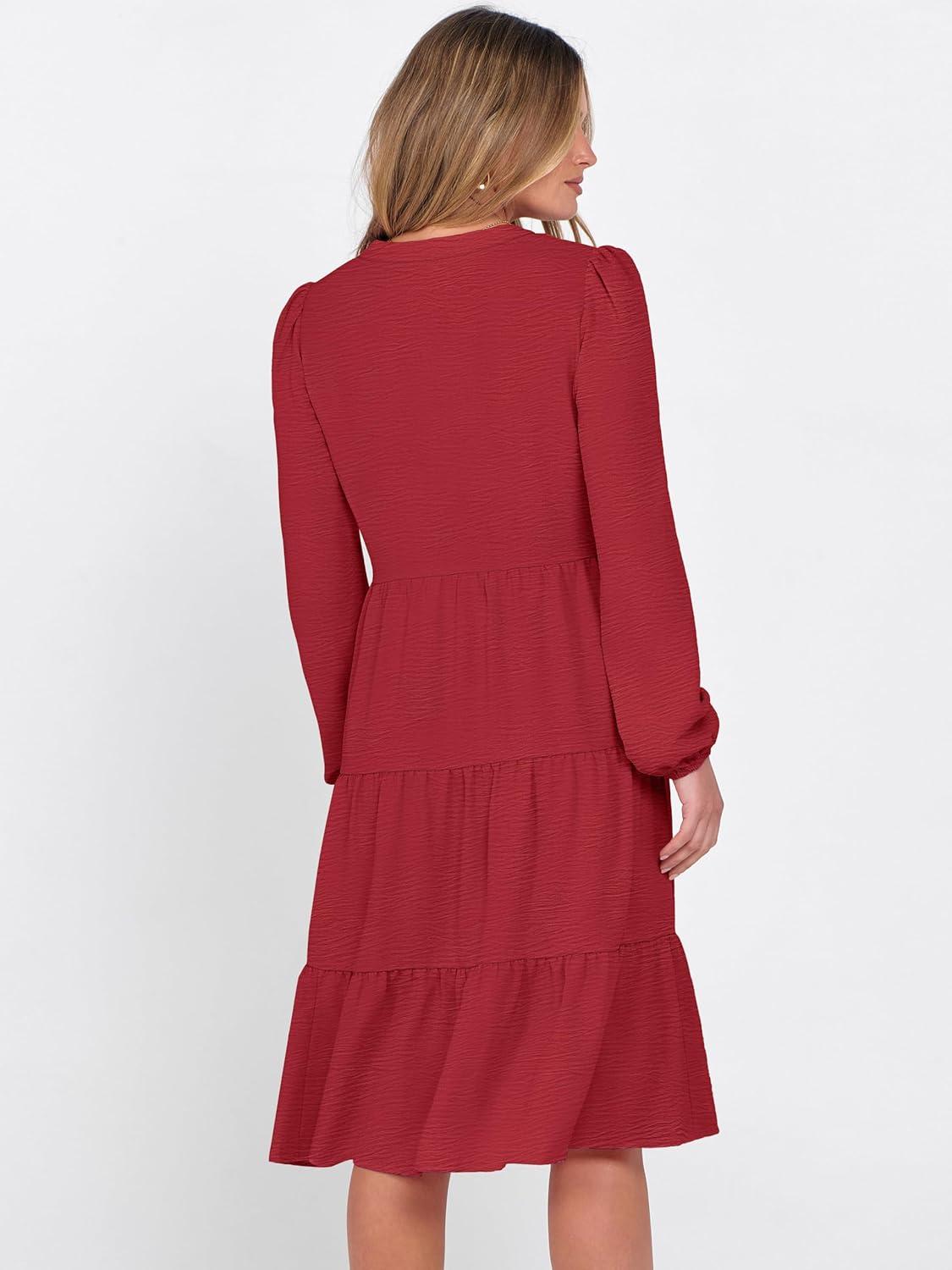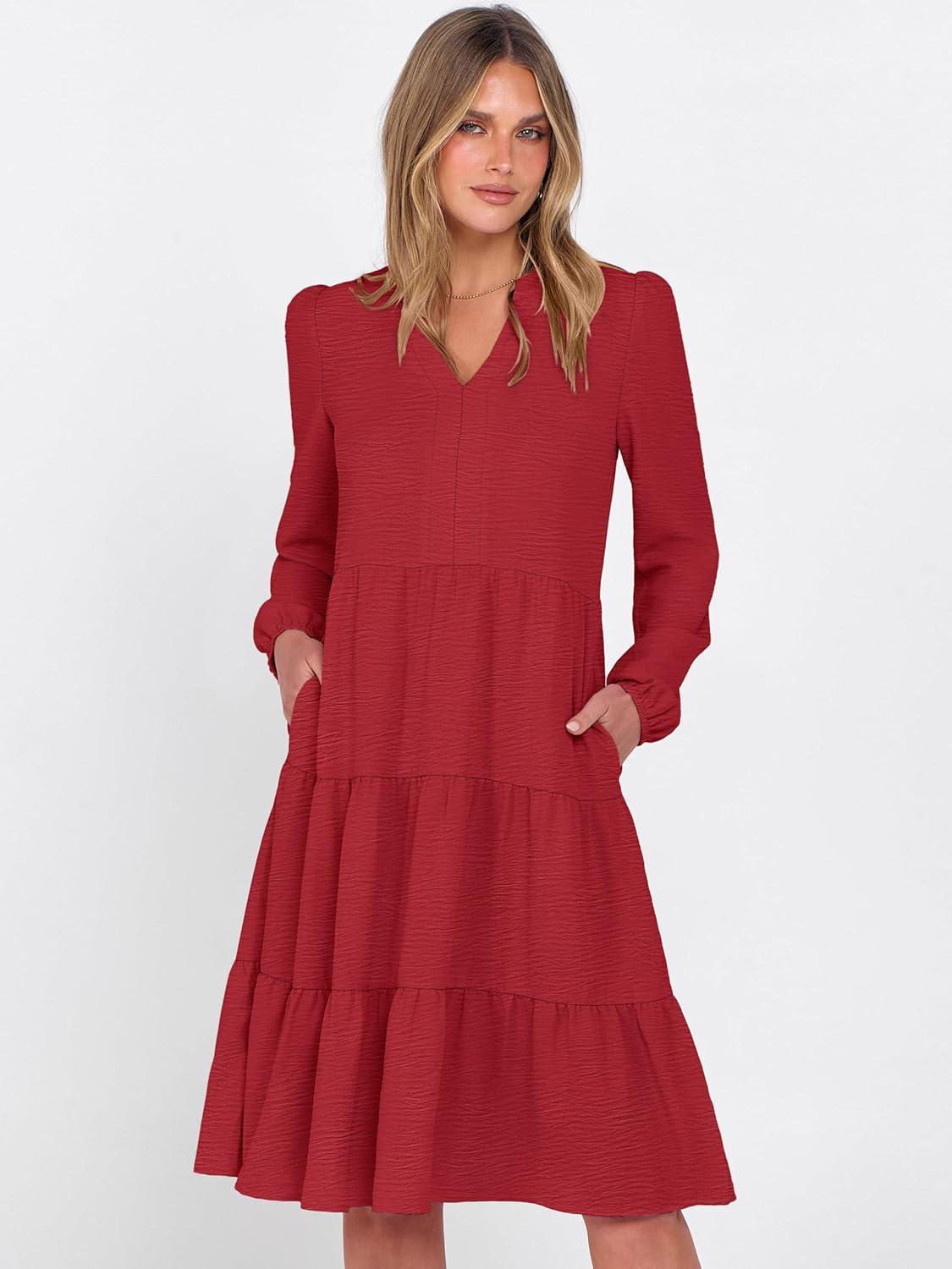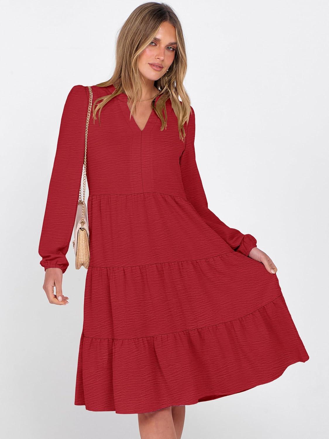 ANRABESS Womens Fall Midi Dresses Long Sleeve V Neck Swing Tiered Work Business Casual 2025 Flowy Beach Vacation Dress(Red)