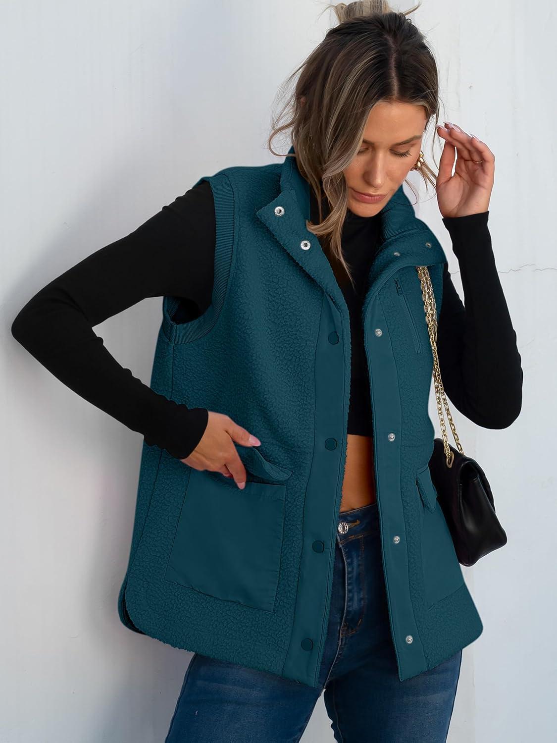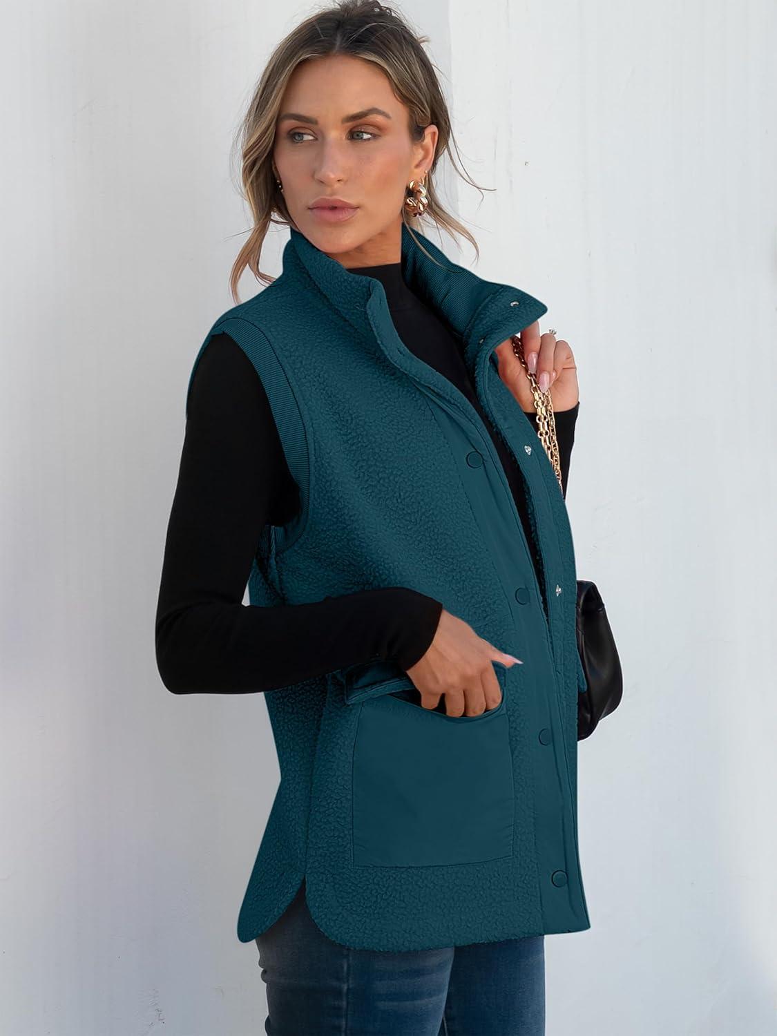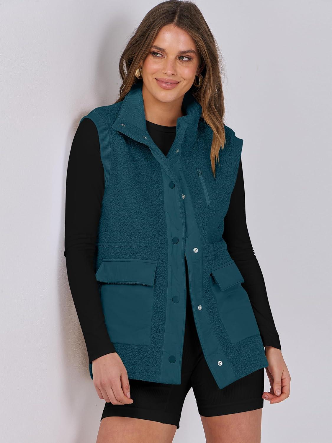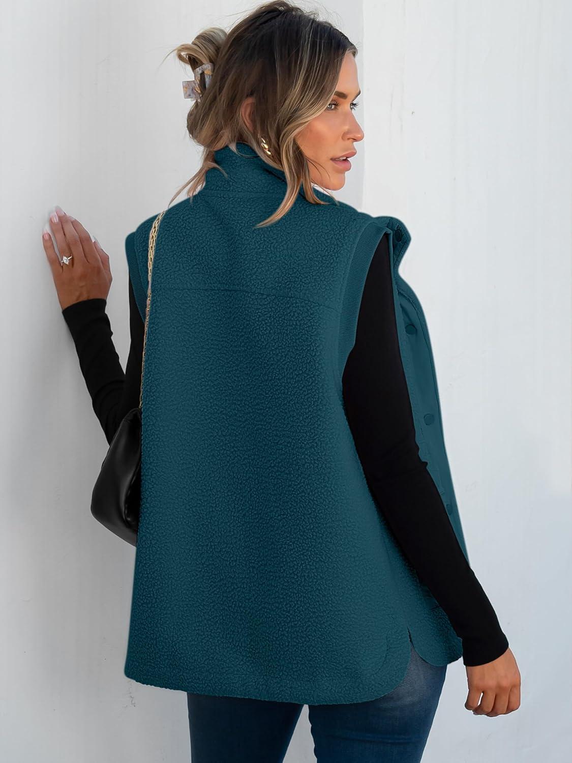 ANRABESS Womens Fleece Vest Loose Warm Button Down Fall Fuzzy Sherpa Jackets Fuzzy Vest With Pockets Winter Outerwear(Cyan)