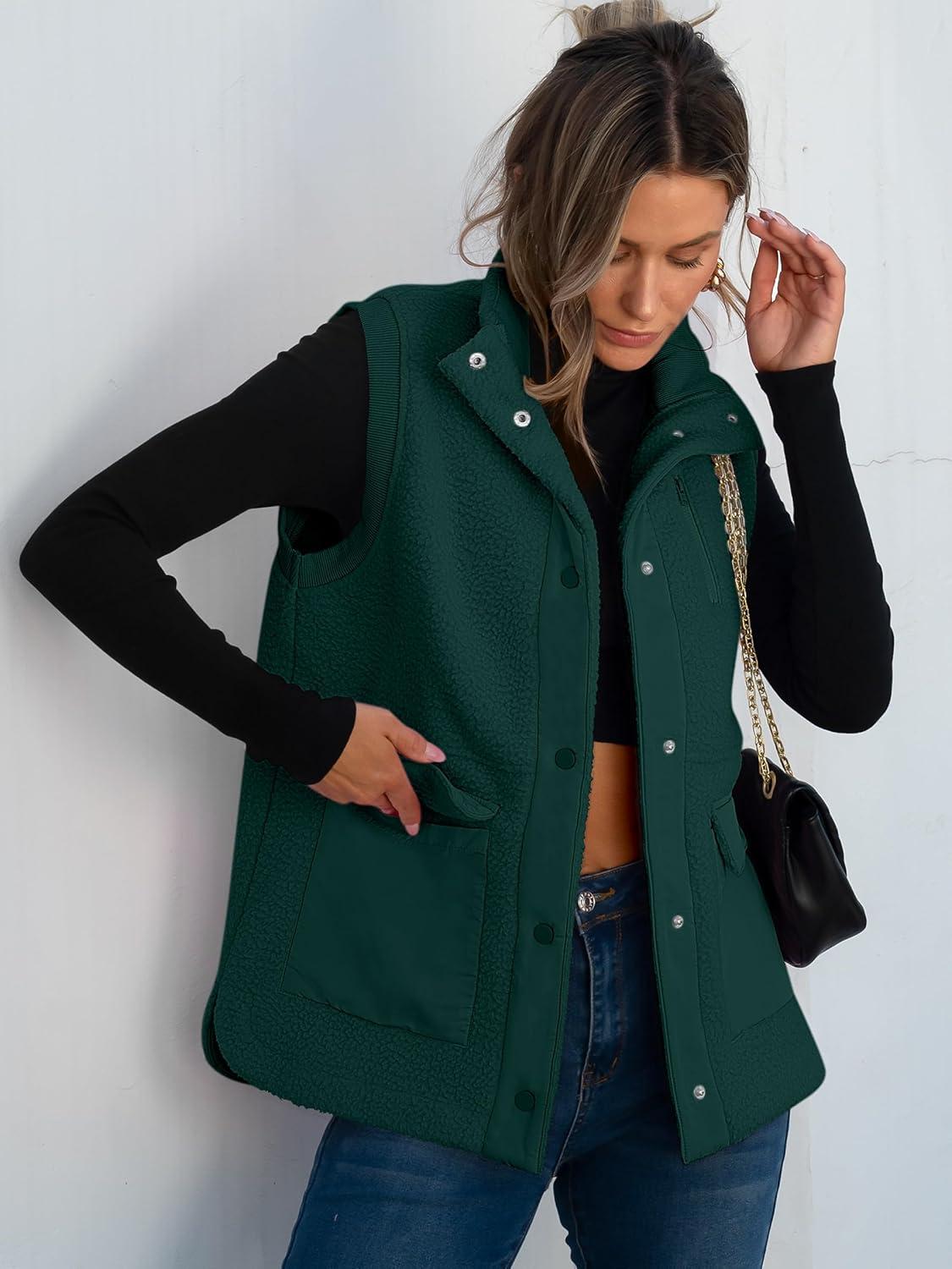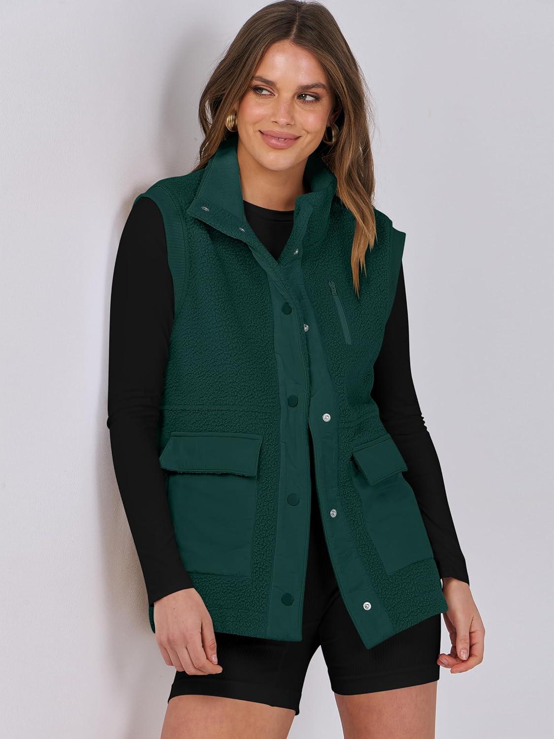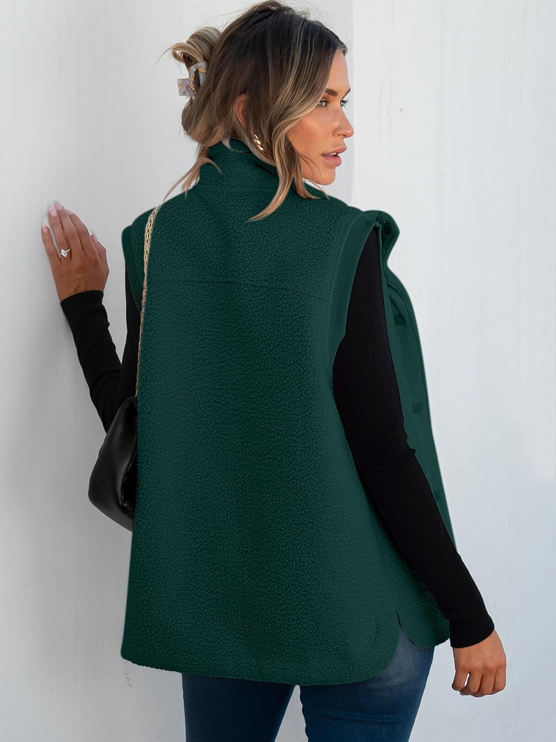 ANRABESS Womens Fleece Vest Loose Warm Button Down Fall Fuzzy Sherpa Jackets Fuzzy Vest With Pockets Winter Outerwear(Deep Green)