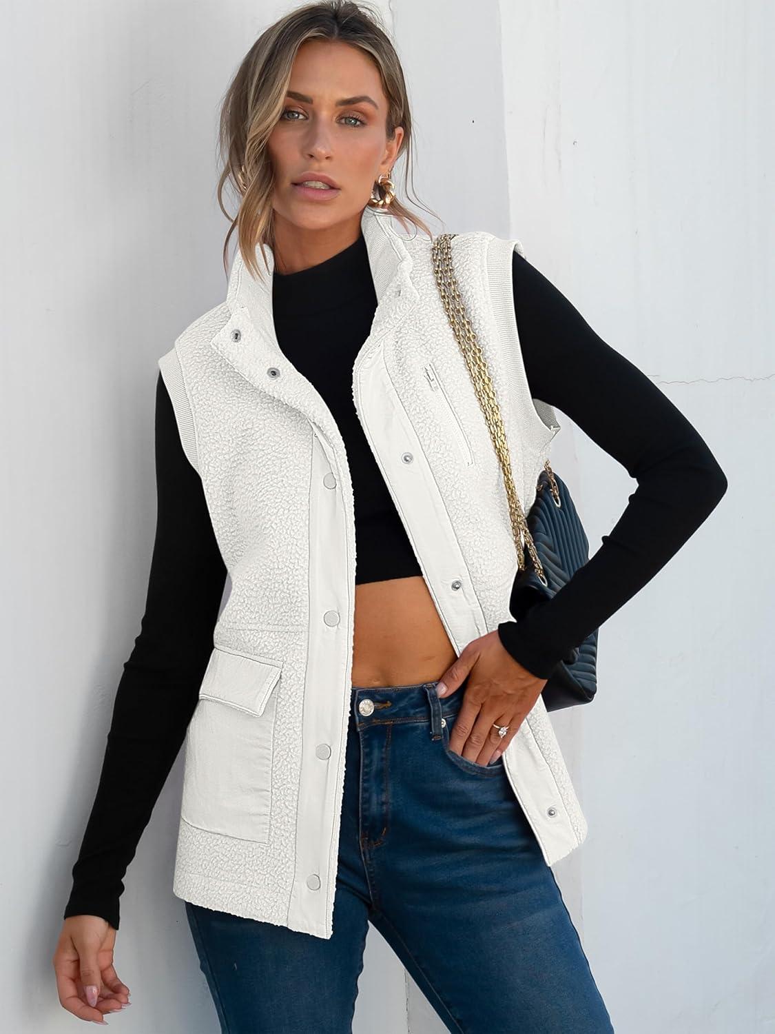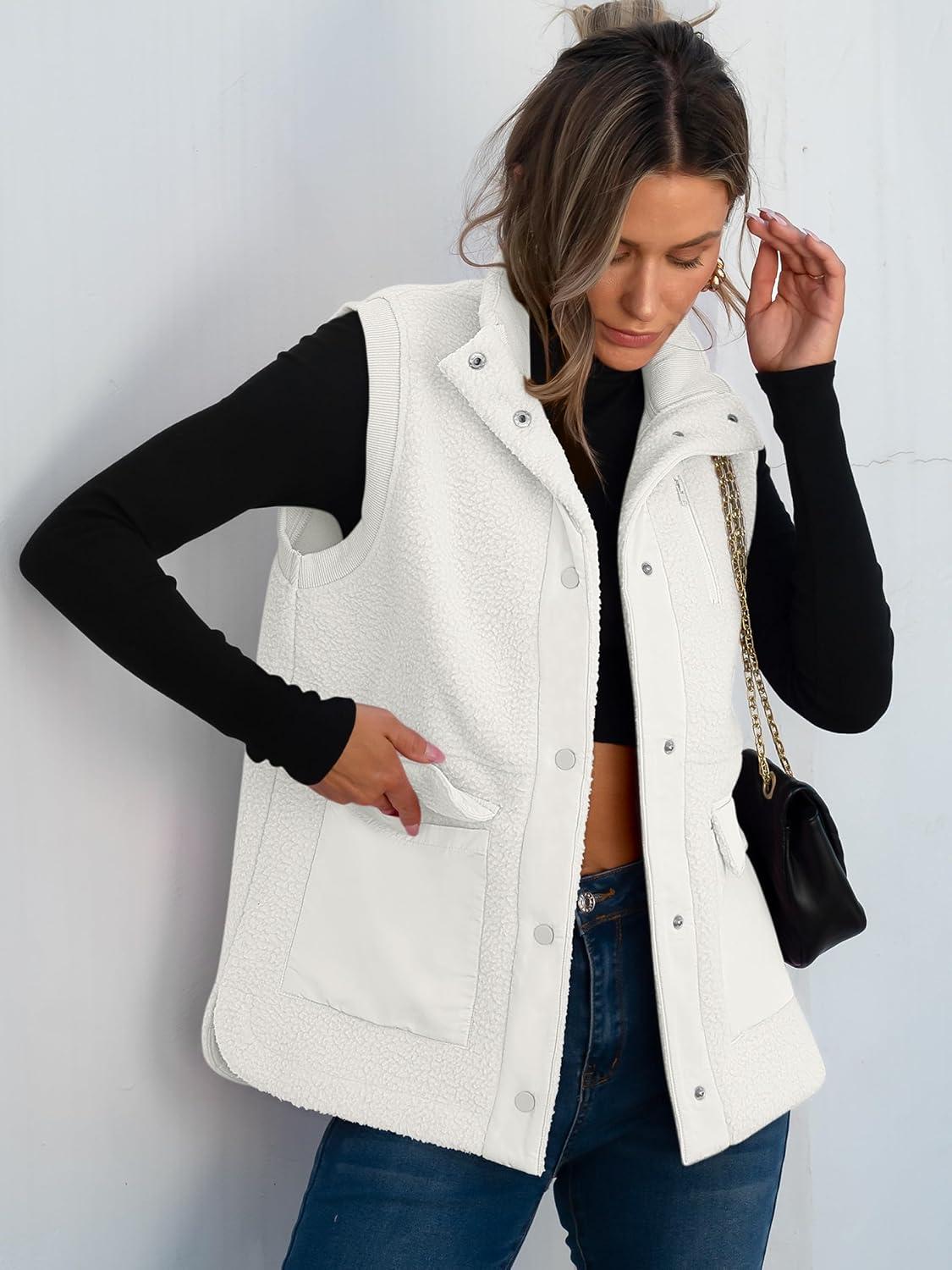 ANRABESS Womens Fleece Vest Loose Warm Button Down Fall Fuzzy Sherpa Jackets Fuzzy Vest With Pockets Winter Outerwear(White)